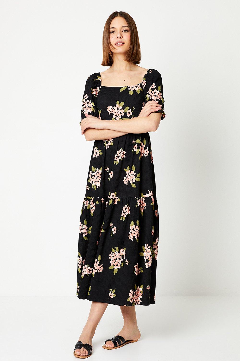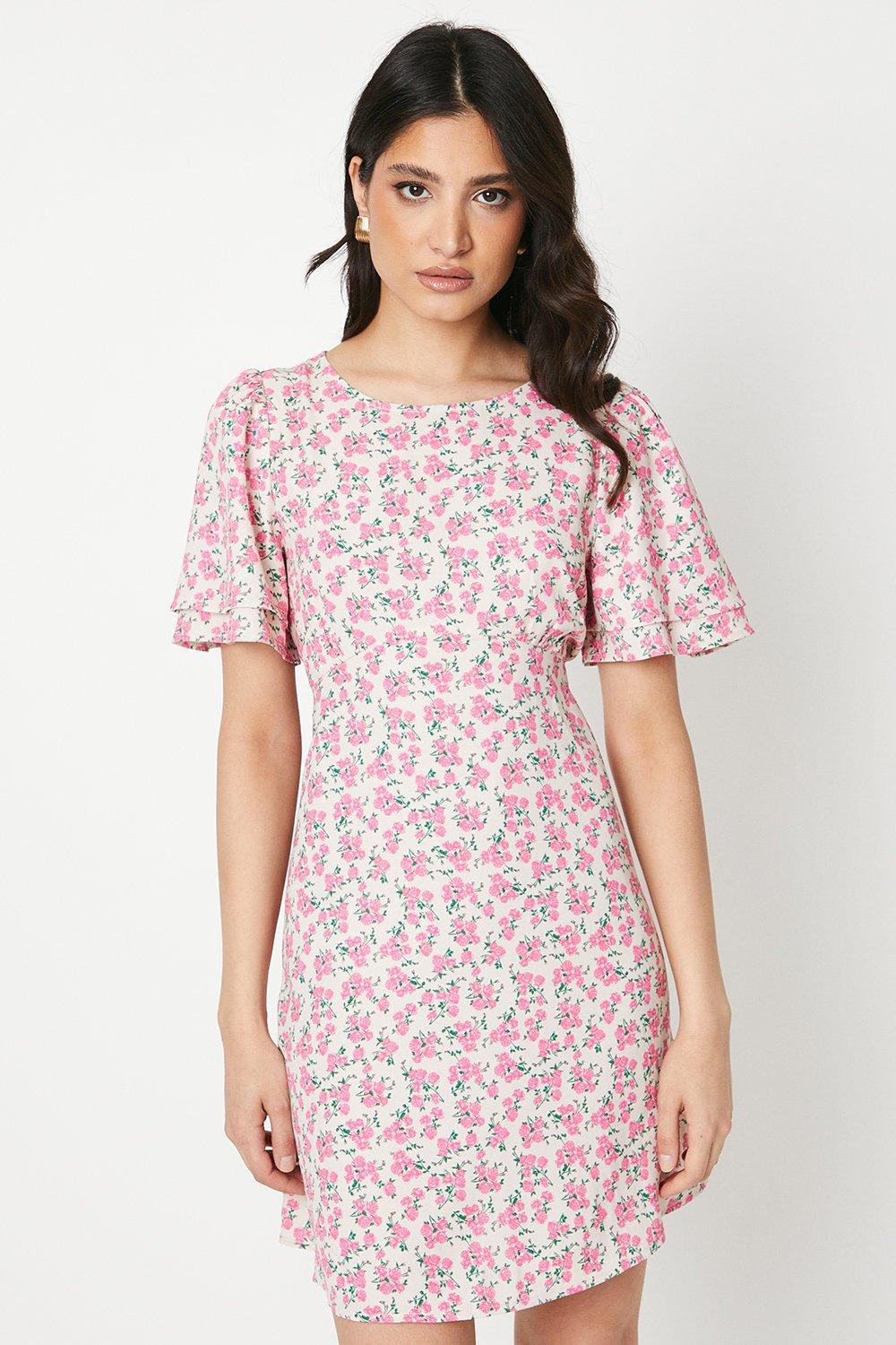 Womens Floral Button Through Flutter Sleeve Midi Dress