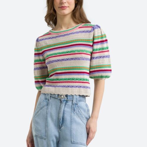 Striped Cotton Openwork Jumper with Puff Sleeves and Crew Neck Suncoo £77.60 -