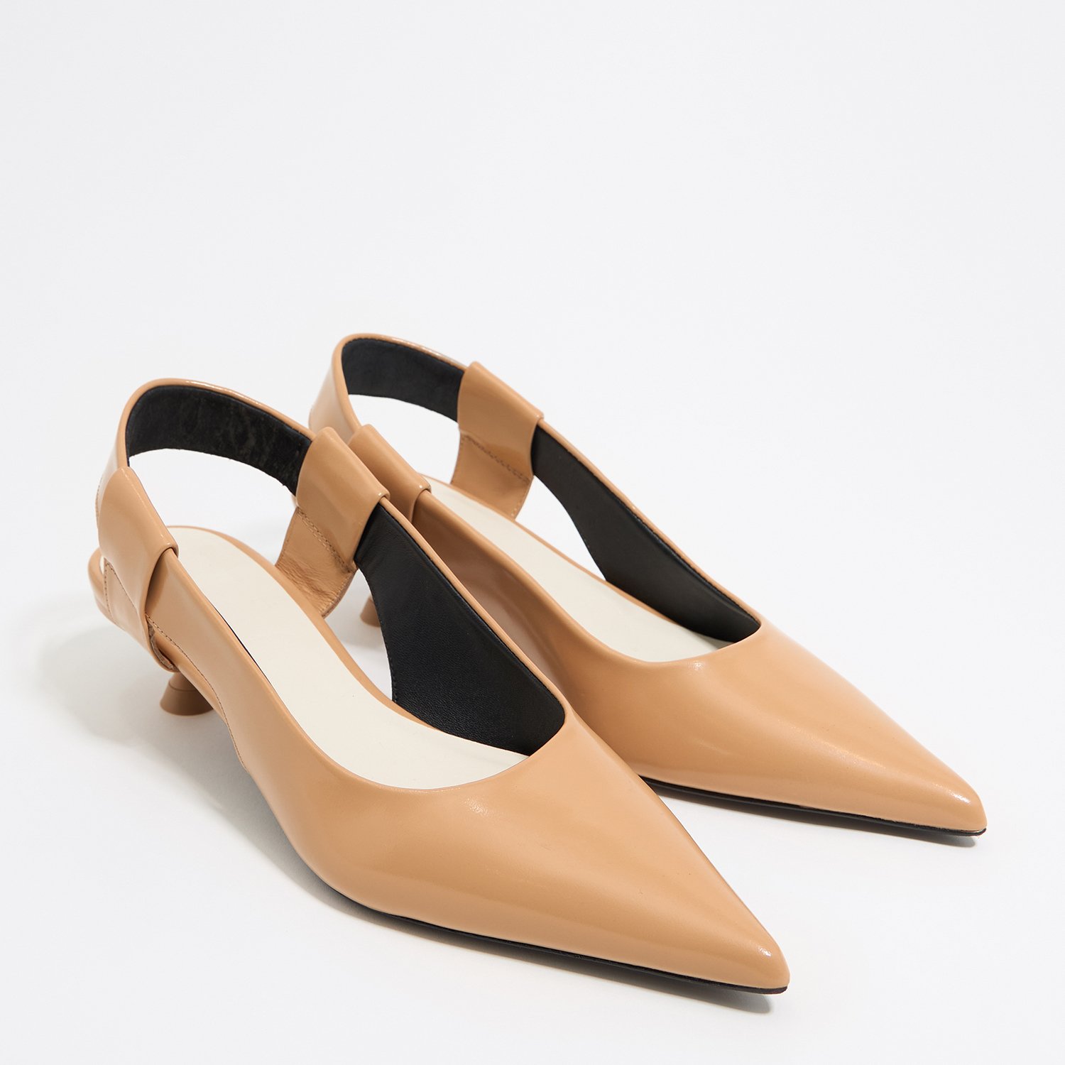 Smooth leather slingback court shoe in almond. Model with pointed toe, square vamp with side posts, and a high heel. Leather insole with engraved logo and customized sole.
