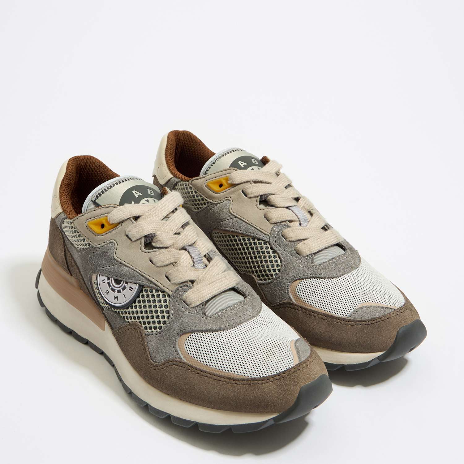 Jogger sneaker in light gray/yellow. Model with split leather pieces combined with technical fabrics. Reflective logo panel at the heel, side silicone label with half Chimo, logo label on the tongue. Customized stabilizer and two-tone track soles.