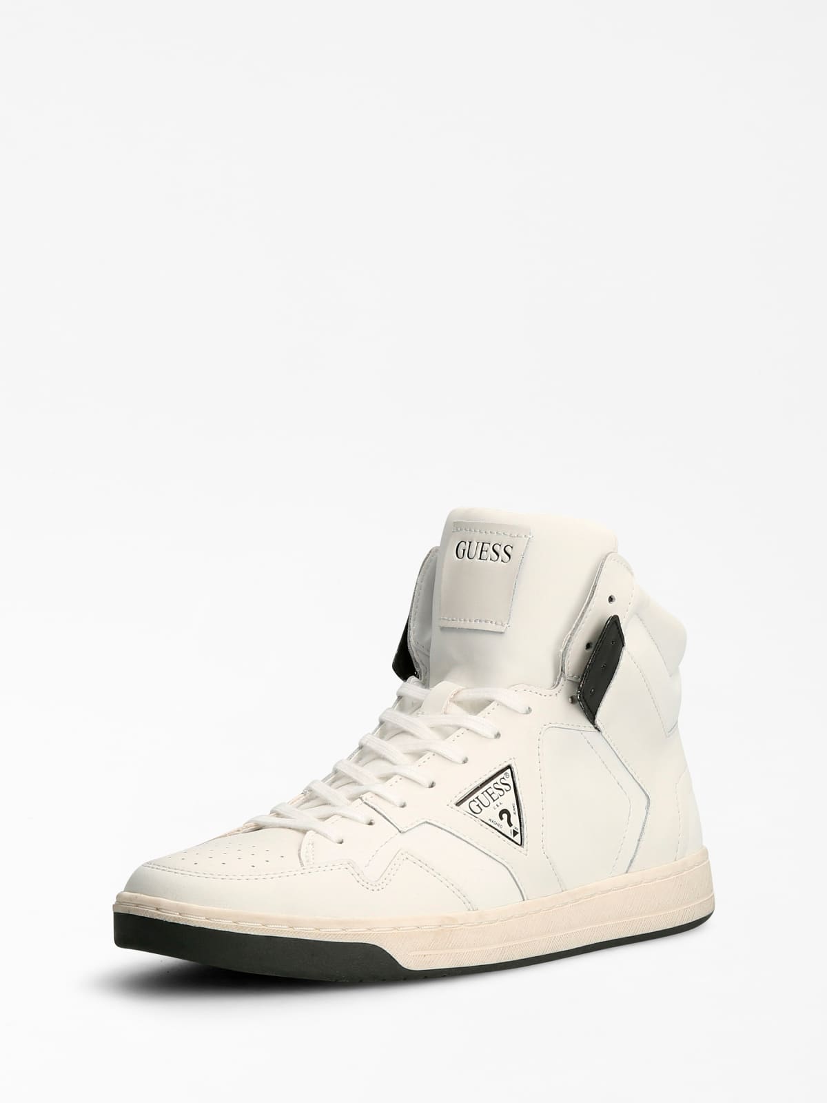 Introducing the stunning and trendy Certosa Basket High-Top Sneaker by Guess! The shoe is designed with a perfect blend of leather that is not only stylish but also durable. It boasts of a round toe with a lace-up model which enhances its overall appearance. The triangle logo detail on the side adds a chic touch to the sneaker, making it perfect for casual outings.