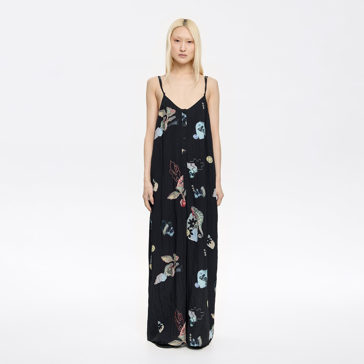 Long jumpsuit A-line Plunging V-neck Straps Button-up front