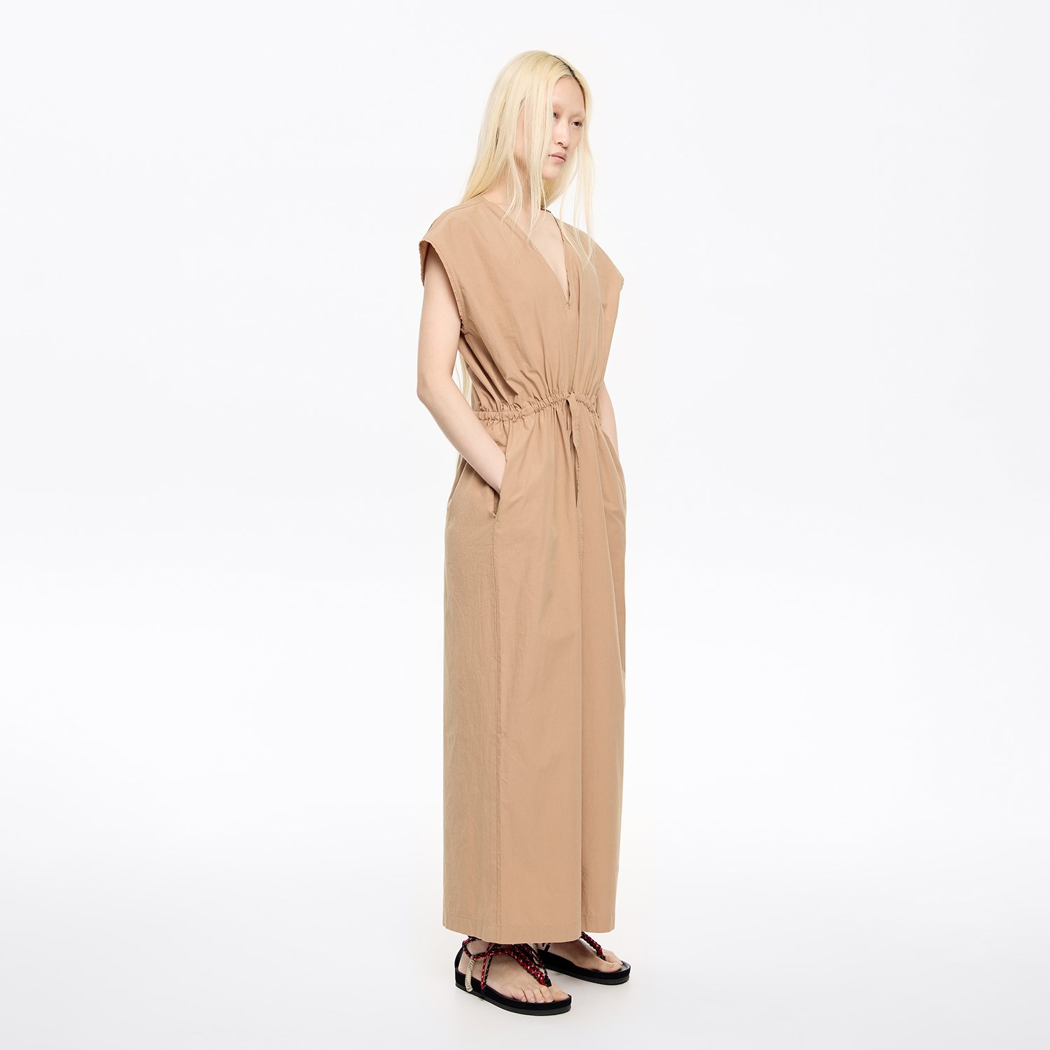 Jumpsuit 100% linen Adjustable waist seam Plunging V-neck Short dropped sleeve Back tie fastener Maxi teardrop back and raw seams