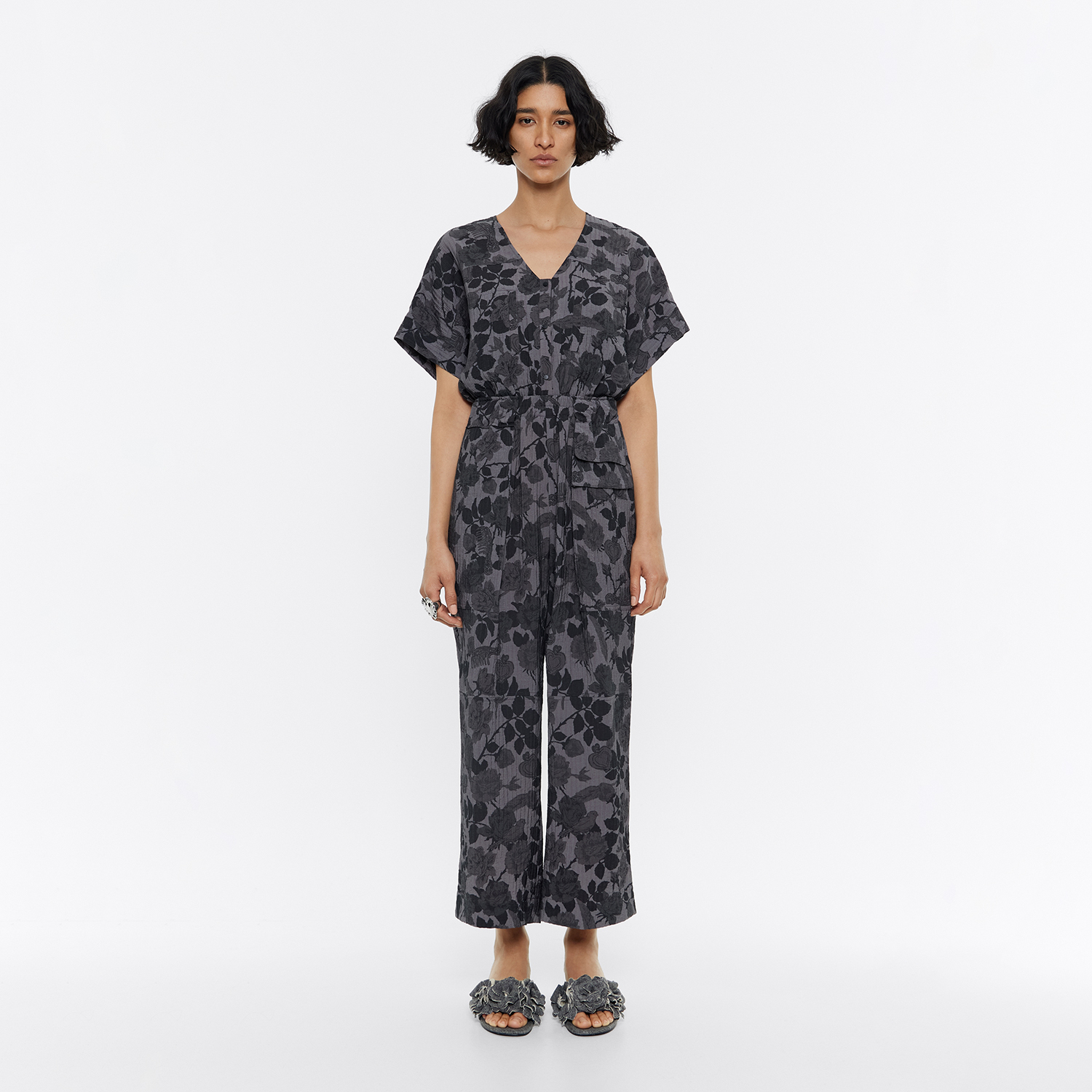 Textured viscose cargo jumpsuit in khaki with Canary Camo print. Ankle length, with plunging V-neck, short sleeve and snap button-up front. Bellow side pockets, gathered waist with elasticated inner and all-over triple-stitched finish.