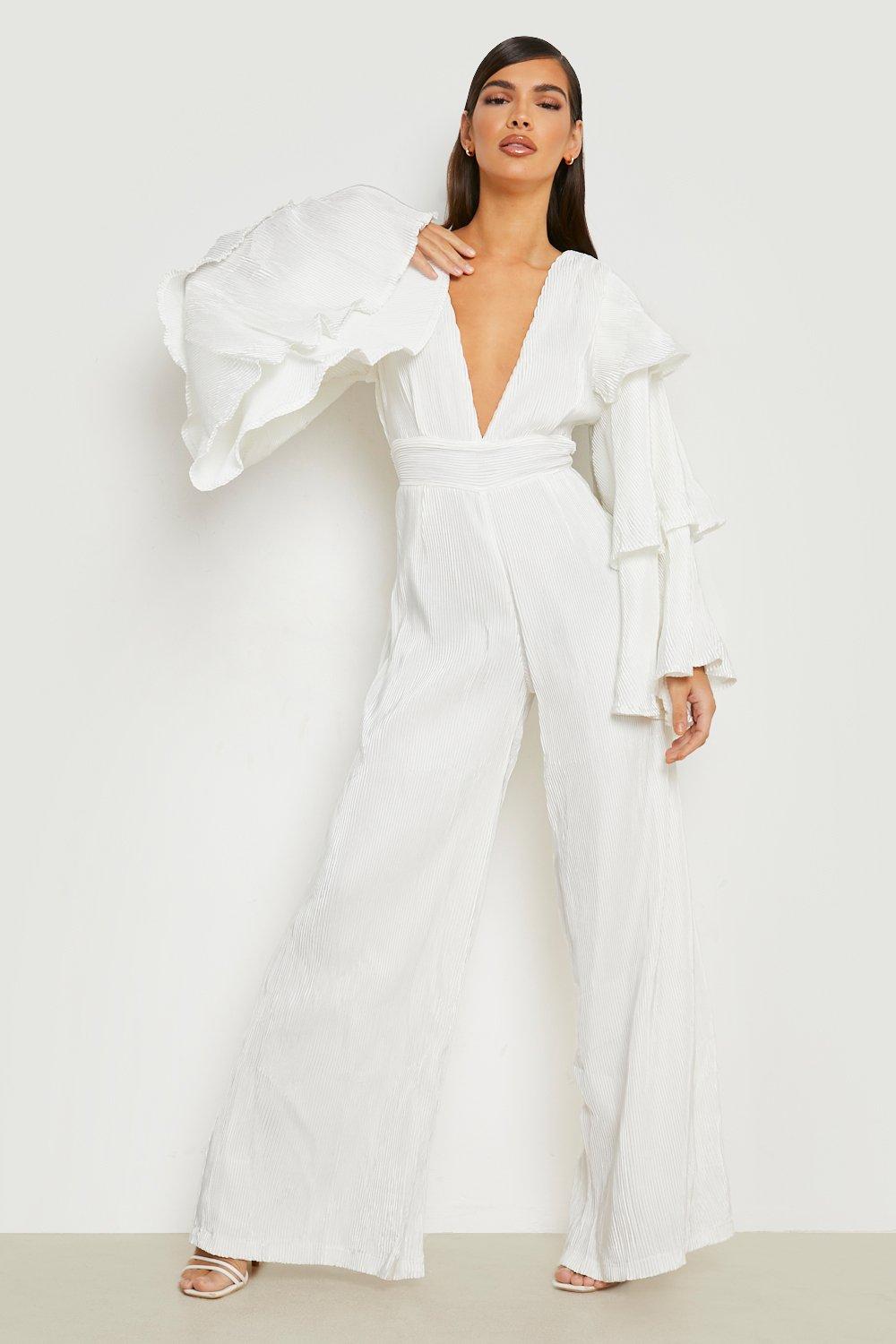 Introducing the must-have wardrobe addition from Boohoo – the Womens Satin Layered Ruffle Sleeve Wide Leg Jumpsuit! If you’re looking for a stylish yet comfortable outfit that can be dressed up or down, this jumpsuit is perfect for you. Made from high-quality satin fabric, it’s both soft to touch and durable. The beautiful white color is simply unbeatable, making this jumpsuit ideal for a range of occasions. Whether you’re headed for a night out with friends or a dinner party, it’s sure to turn heads.