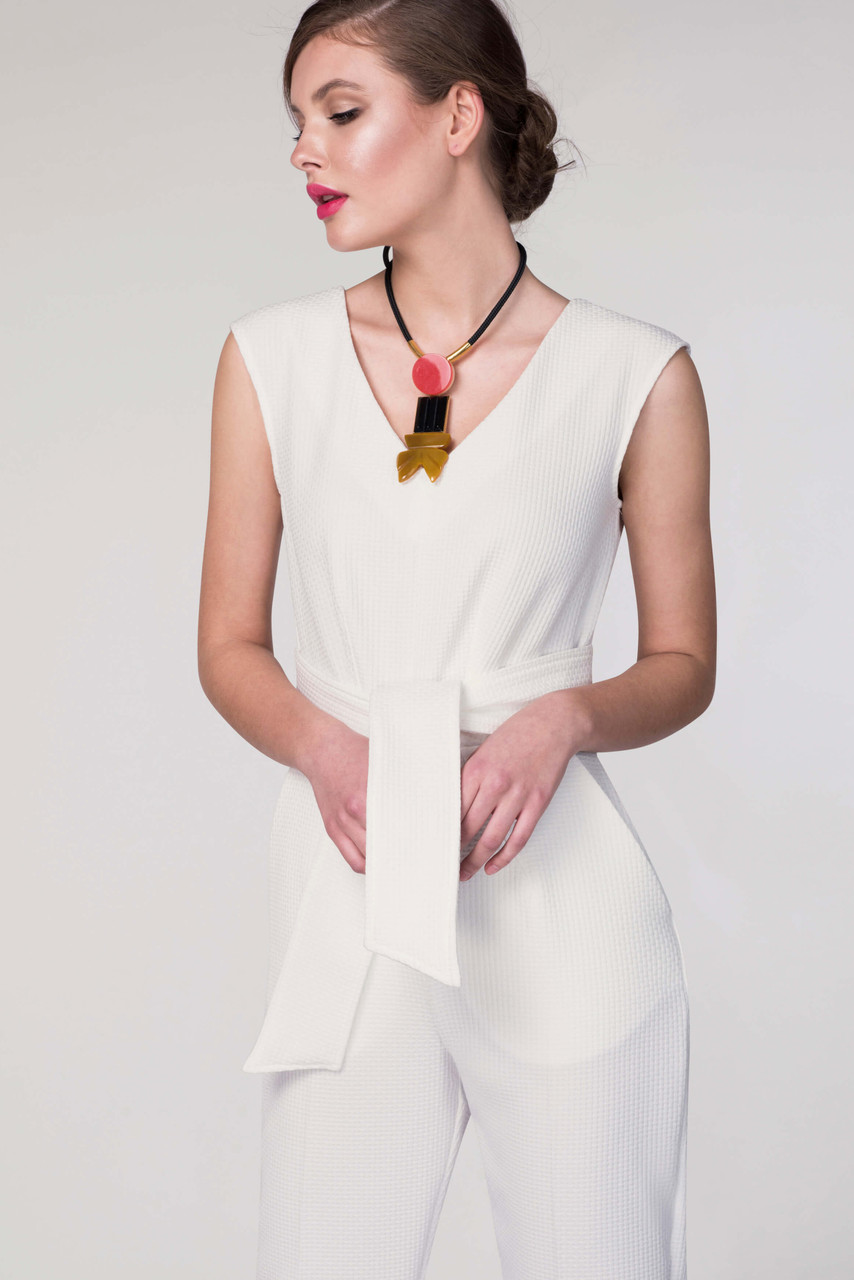 This white V-neck front tie jumpsuit from Closet London is the perfect addition to your summer wardrobe. It exudes elegance and femininity with its subtle yet attractive shape and the fun front tie detail. The jumpsuit features cap sleeves and a tie waist band for added comfort and style.