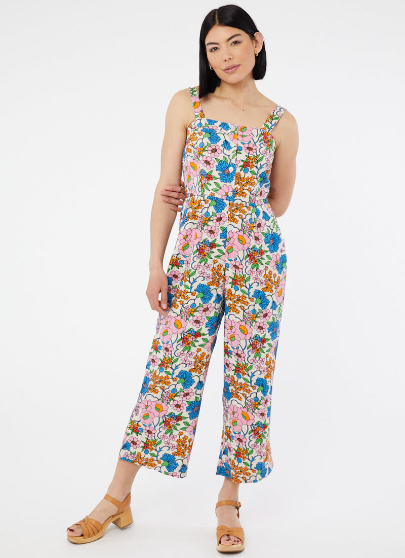 Designed with your comfort in mind, the Randi jumpsuit offers a flattering square neckline and wide fixed straps. The fully-lined bodice features retro buttons down the front, adding a touch of vintage charm. The back of the jumpsuit is elasticated shirring, ensuring a perfect fit for all body shapes. The ⅞-length wide legs provide a stylish and comfortable silhouette, complete with pockets at the hip for added functionality.