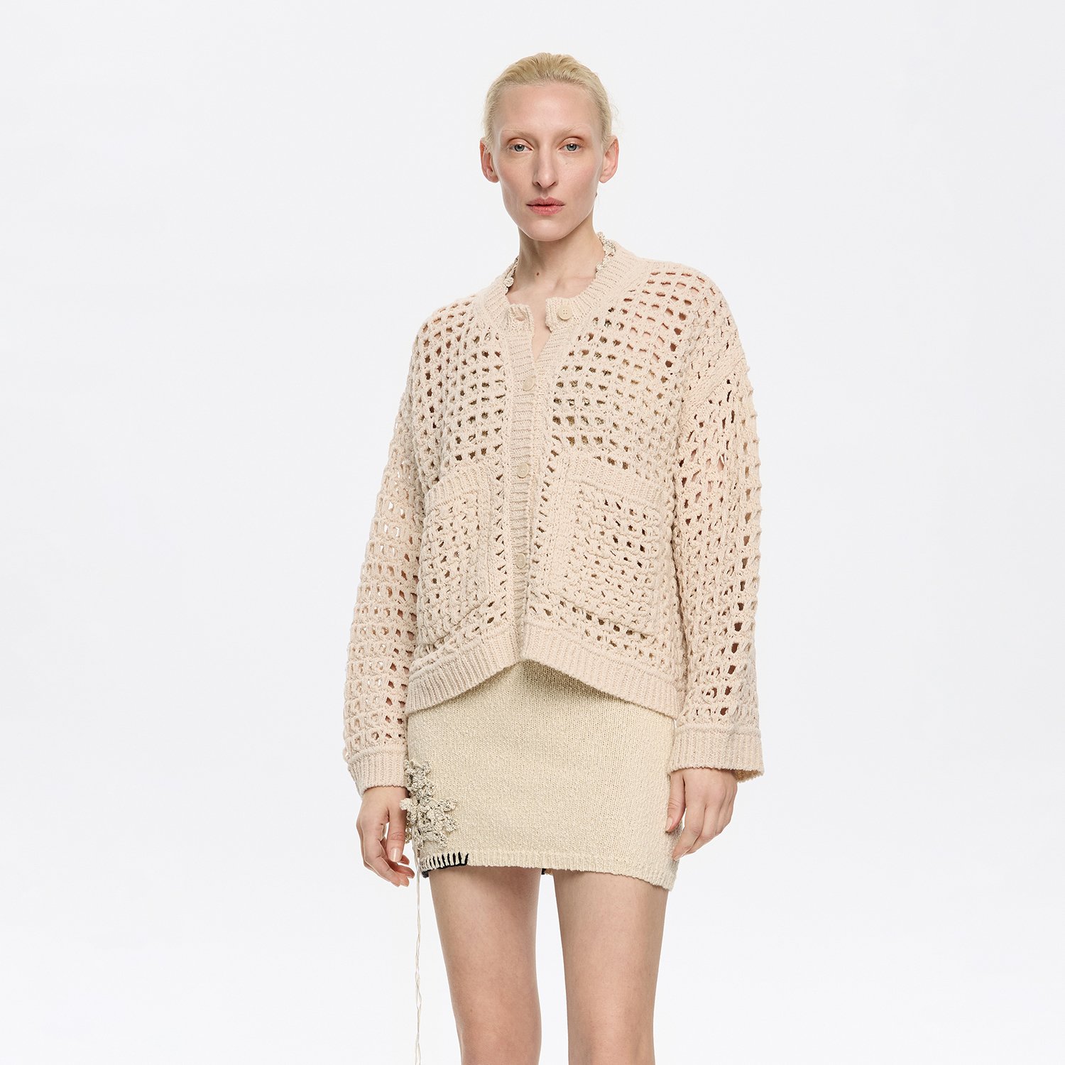 Short openwork cardigan Straight cut Button-up front Crew neck Long, straight and wide sleeves Maxi patch pockets