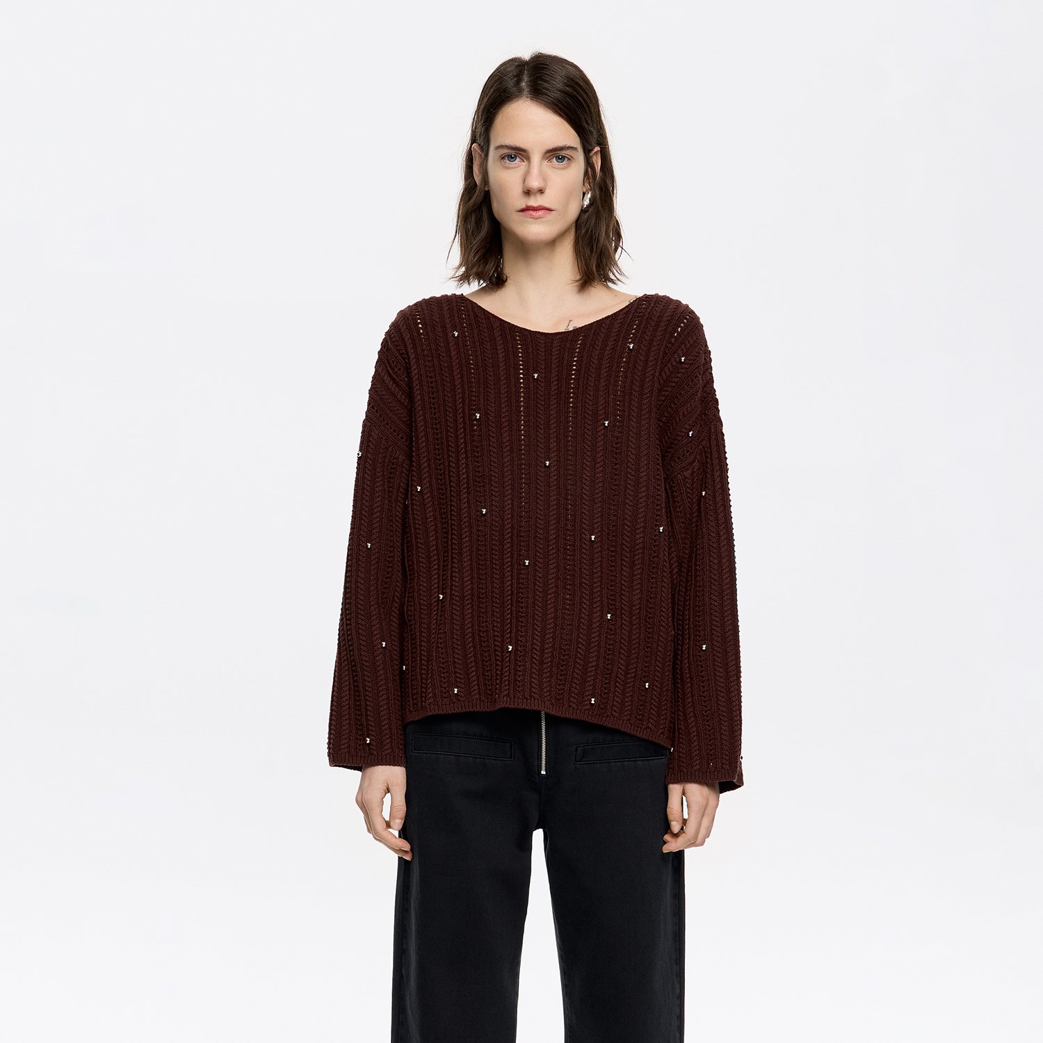 Cotton sweater in brown. Boxy cut, with rounded boat neck, long straight and wide sleeve and all-over metallic beads.
