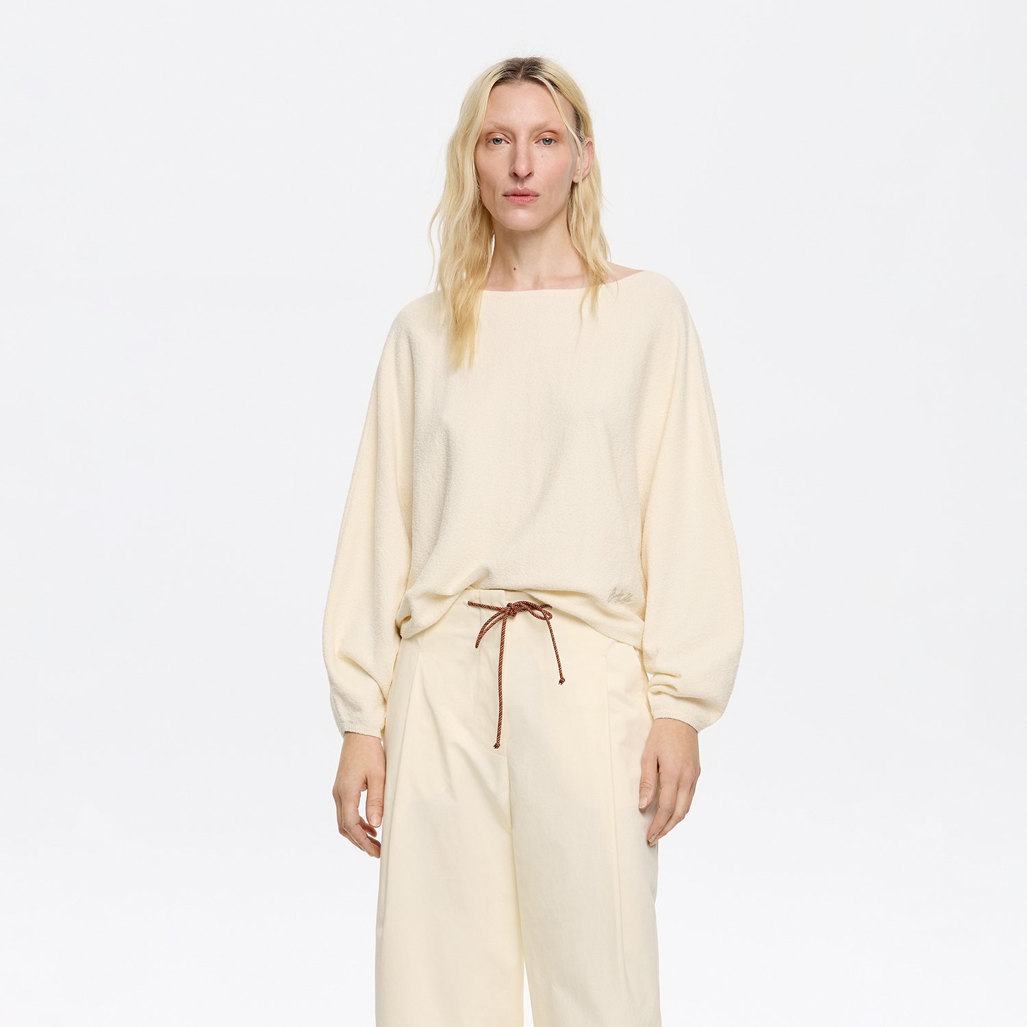 Knit sweater in ivory. Fitted at the waist, with boat neck, long batwing sleeve with tight cuff and exterior customized with embroidered logo.