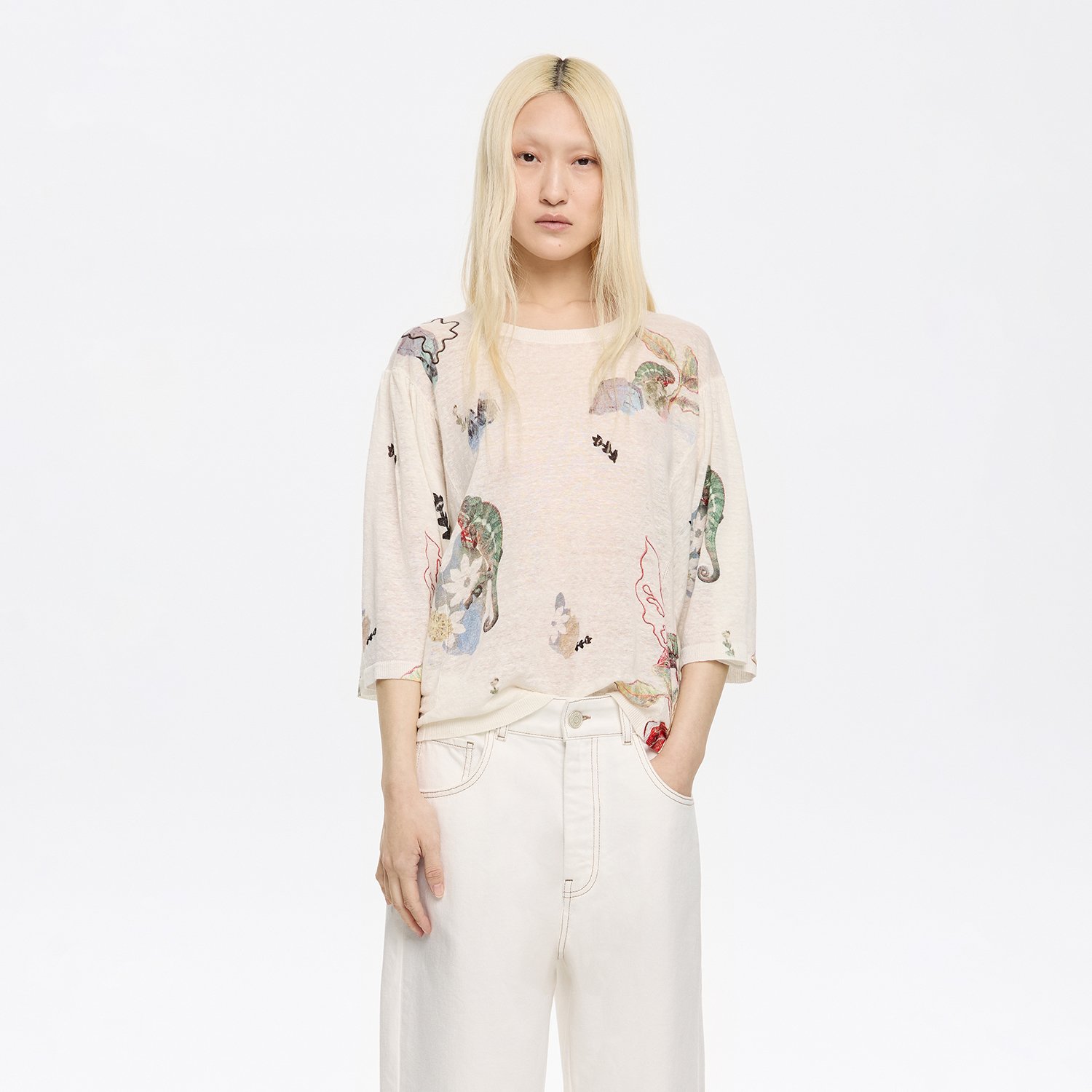 Sweater Straight cut Linen blend Crew neck 3/4 sleeve with narrow cuff Square armhole with gathered shoulder for added volume