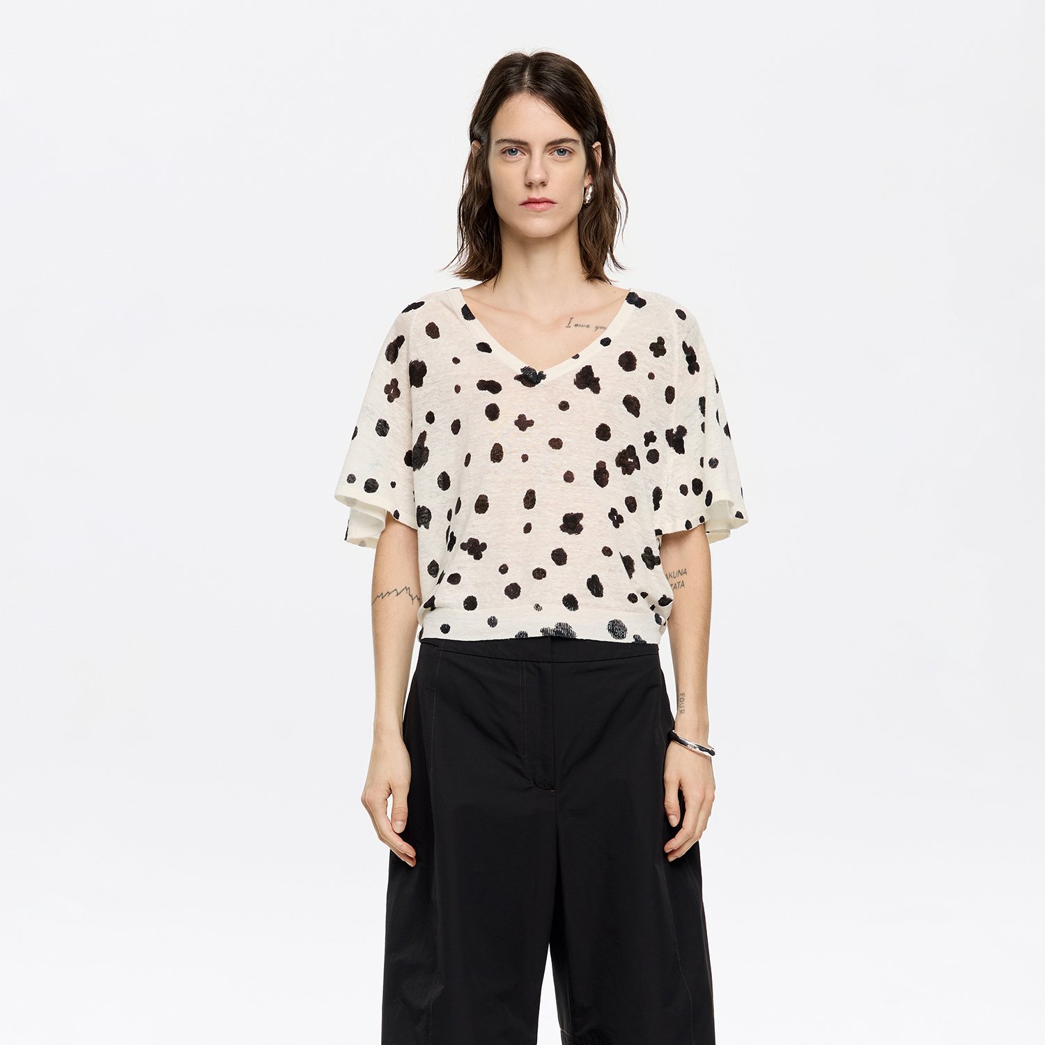 Linen sweater in ivory with Graindots print. With fitted waist, V-neck and short batwing sleeve.