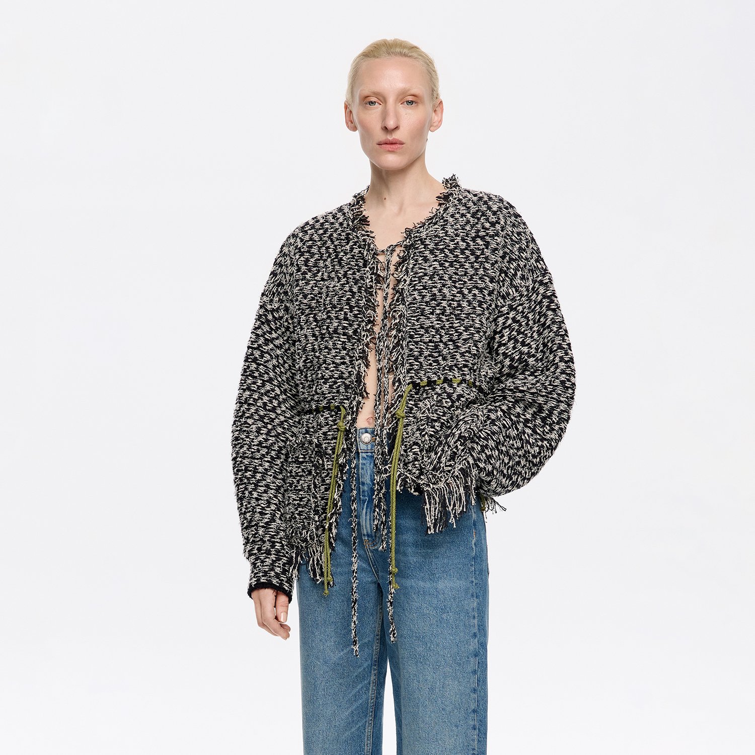 Long cotton cardigan in black. Straight cut with V-neck, long straight sleeve, and frayed finish at the pockets and neckline.