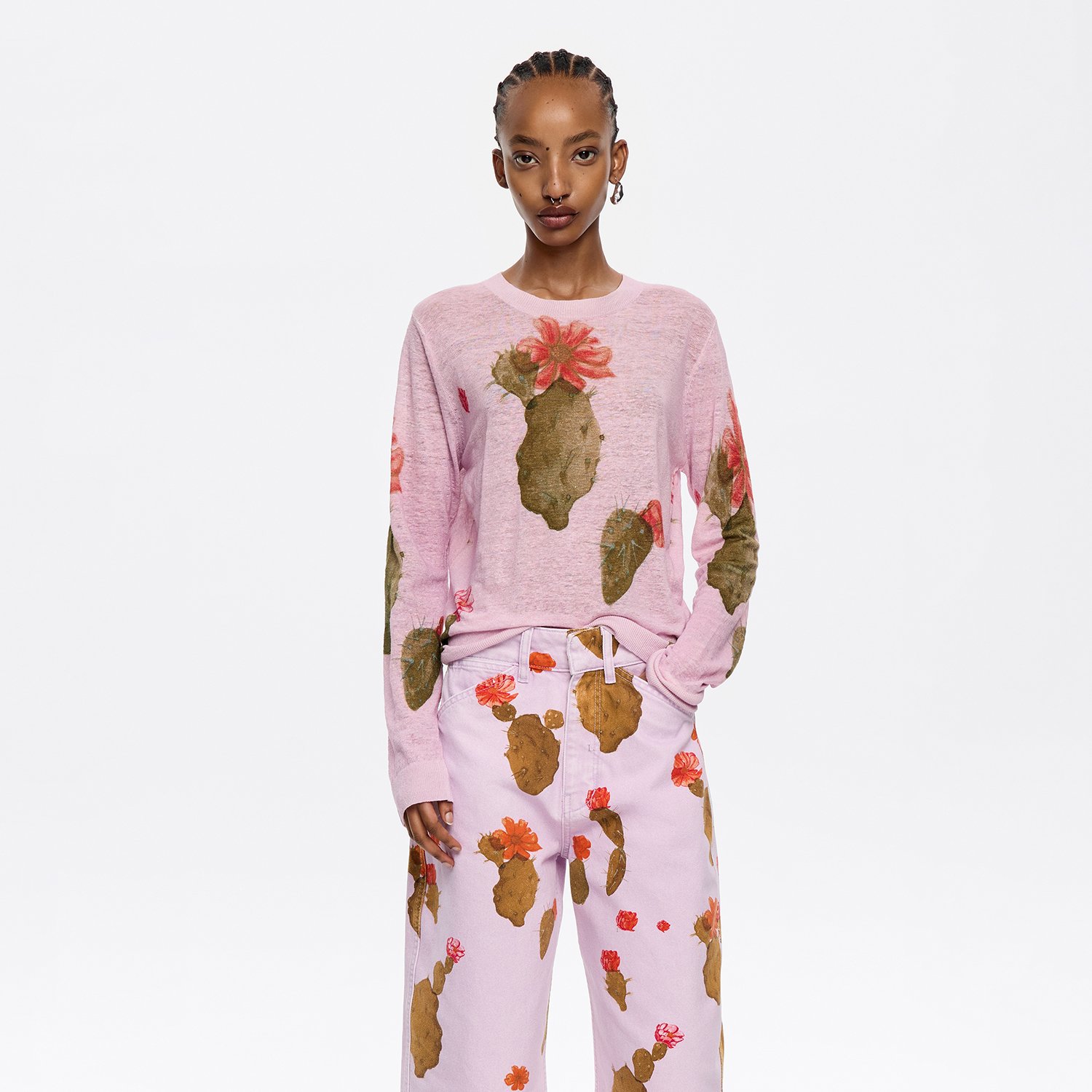 Linen sweater in pink with big Cactus print. Straight cut, with crew neck and long fitted sleeve.