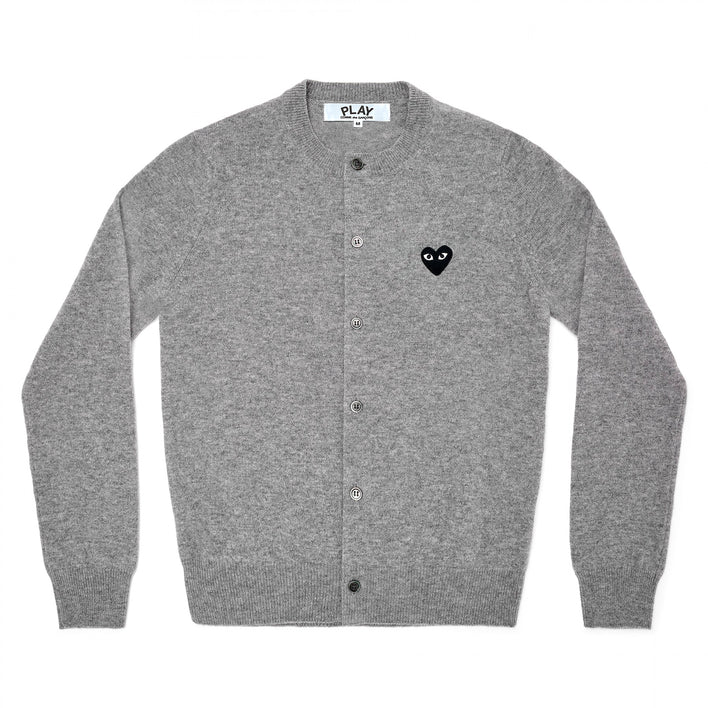 COMME DES GARÇONS PLAY Play Black Heart CARDIGAN Light Grey The Comme Des Garçon Play Black Heart Cardigan in Light Grey is a timeless layering piece with a playful edge. This button-up cardigan features a relaxed fit and the brand’s signature black heart logo embroidered on the chest. Perfect for adding subtle sophistication to your casual wardrobe, it pairs effortlessly with everything from jeans to tailored trousers.   HIGHLIGHT Wool Heart patch at the chest Round neck Front button fastening Long sleeves Ribbed cuffs and hem Internal logo patch COMPOSITION Wool 100%   Product ID: AXN023-051 Season: PS25 Collection