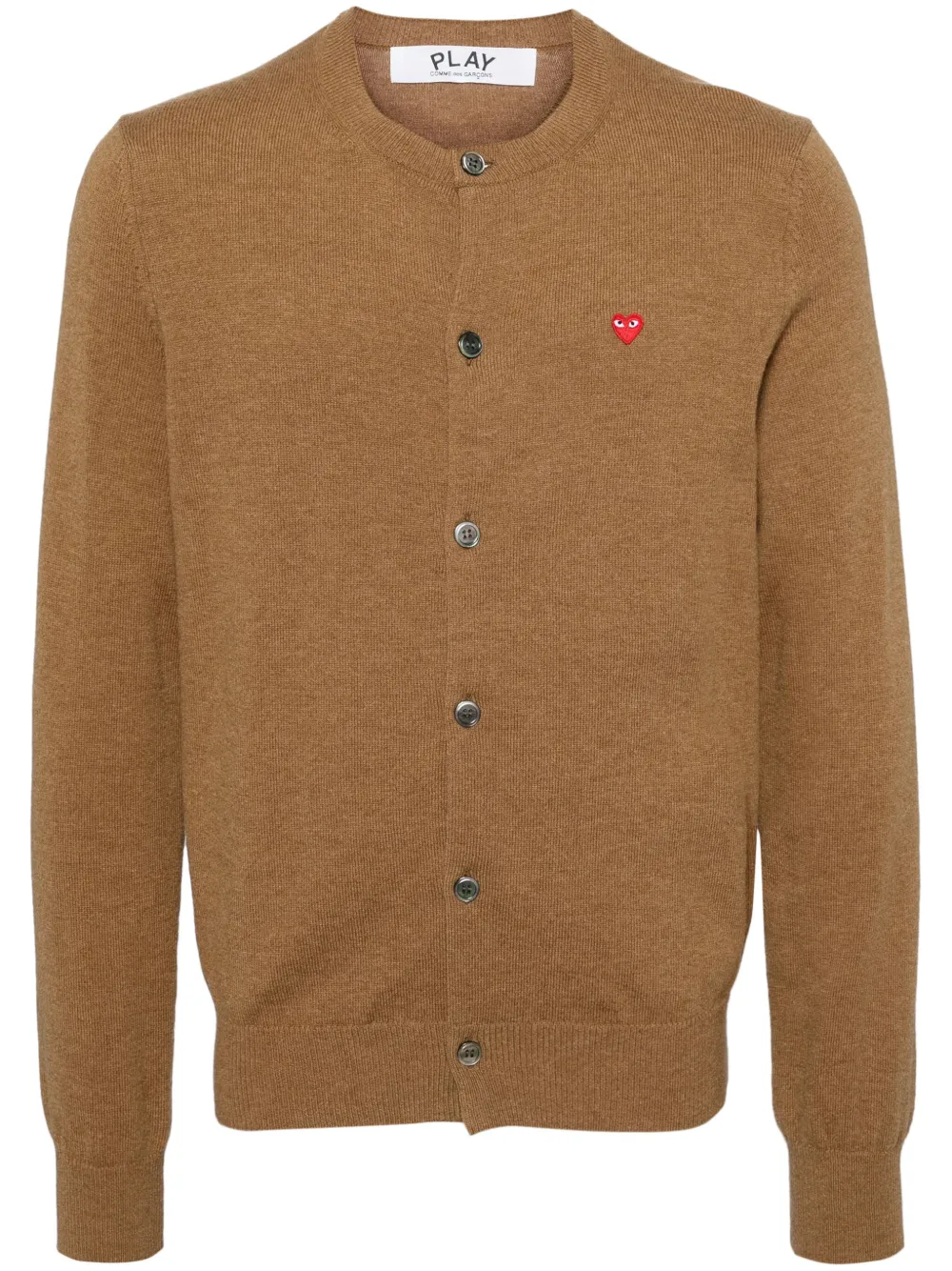 COMME DES GARÇONS PLAY Small Heart CARDIGAN Brown The Comme Des Garçons Play Small Heart Cardigan in Brown is a versatile and elegant knit crafted from premium wool. Designed with a classic button-up front, it features the signature small red heart logo embroidered on the chest, offering a subtle pop of charm. Perfect for layering, this cardigan adds a warm and sophisticated touch to any outfit. HIGHLIGHT Wool Heart patch at the chest Round neck Front button fastening Long sleeves Ribbed cuffs and hem Internal logo patch COMPOSITION Wool 100% Product ID: AXN079051-3 Season: PS25 Collection