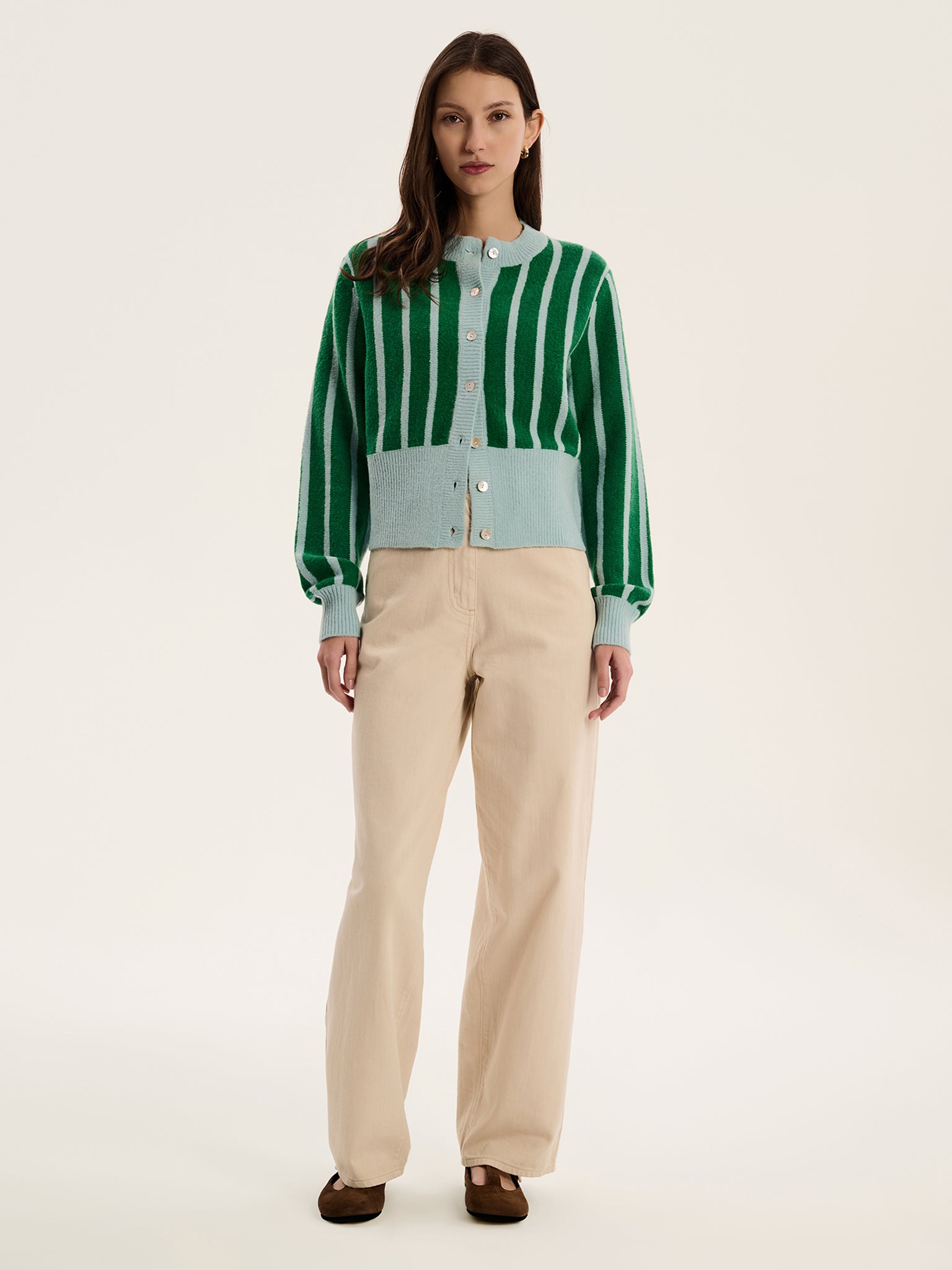 Perfectly proportioned, Flynn is the cardigan that you’ll find yourself reaching for again and again. With a high round-neck, Flynn is woven from soft recycled yarns in contemporary green and blue stripe. Wear with your favourite high-waisted, ethically crafted trousers for a casual cool look.