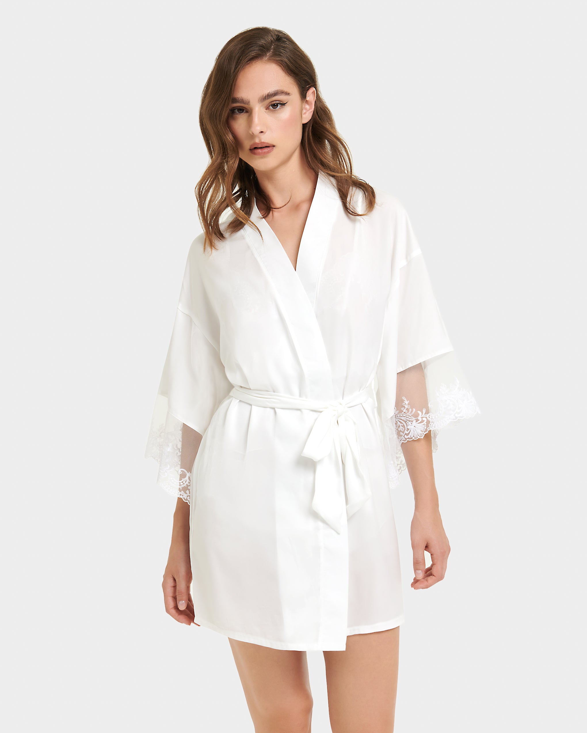 Crafted from sleek satin with a semi-sheer finish, this kimono is as seductive as it is elegant. The lightweight fabric drapes beautifully over curves, while the soft texture feels delightfully luxurious against the skin. Its crisp white color completes the look, giving off a sophisticated and effortless vibe.