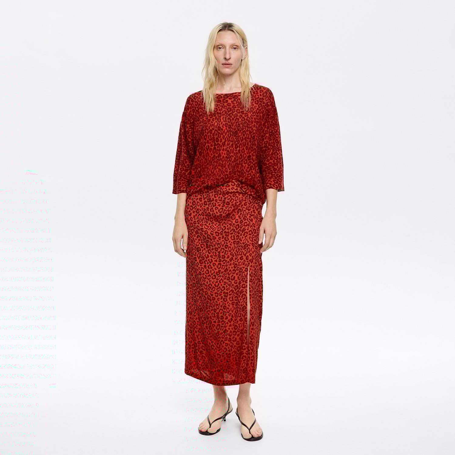 Viscose midi skirt with textured Animalspots print in red. Design with concealed side zip fastener, maxi front slit, and pleats at the waist and hip.