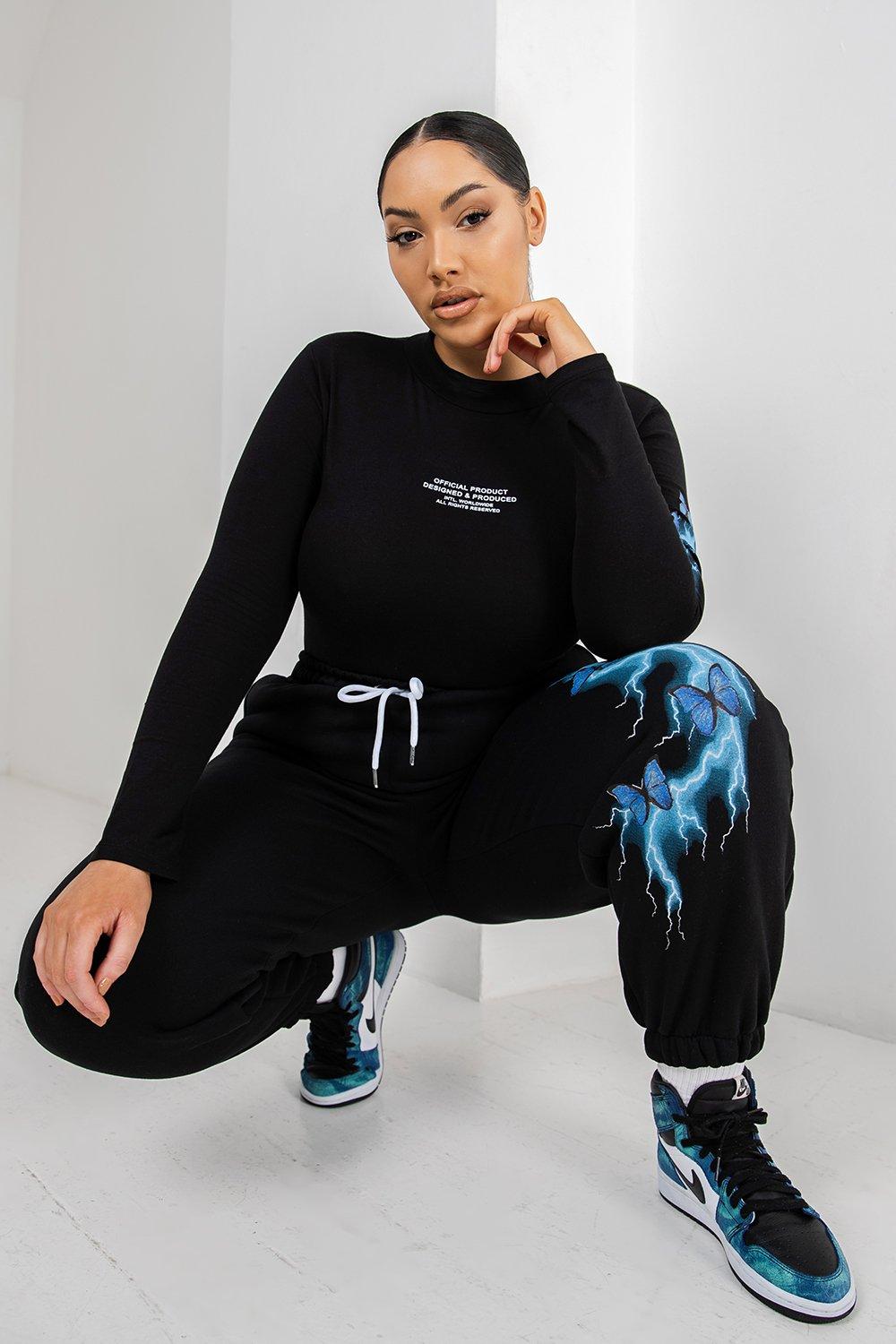 Introducing the Boohoo Womens Plus Lightening Print Bodysuit & Jogger Set, a must-have addition to your wardrobe. This black set is specifically designed for plus size women who crave both style and comfort. Made from a loose and stretchy fabric, this set offers maximum comfort for those off-duty days or work from home sessions.