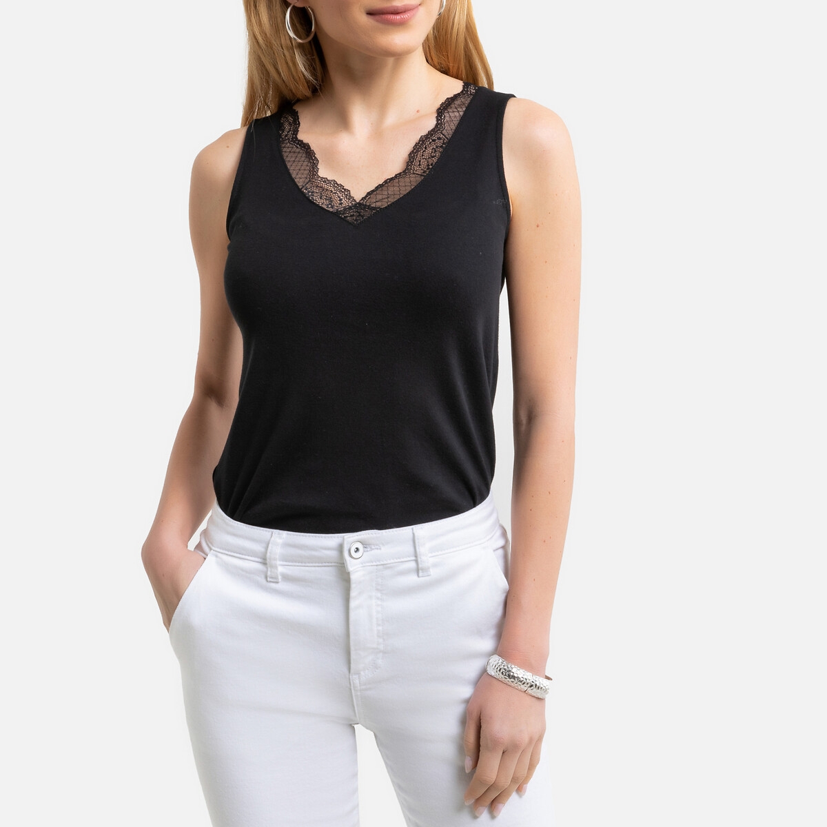Looking for a vest top that is both ultra-feminine and comfortable? Look no further than the Anne Weyburn Cotton Vest Top with V-Neck. This top features a delicate lace trim at the V-neck, adding a touch of elegance to any outfit. The sleeveless design is perfect for warm weather, and the length is ideal for pairing with pants, shorts, or skirts.
