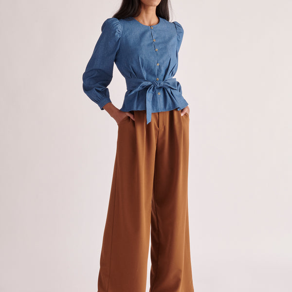 Paisie Long sleeve belted denim blouse