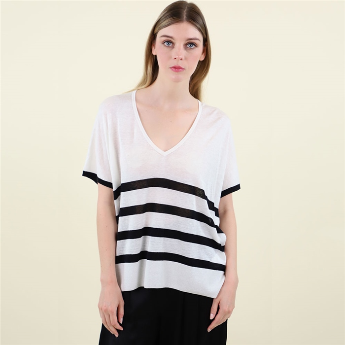 Top Linen And Silk Stripe by Estheme Cashmere This linen and silk stripe top by Estheme Cashmere combines style and luxurious comfort effortlessly. Crafted from a soft, lightweight linen, silk and lurex blend, it features a flattering v-neck ….