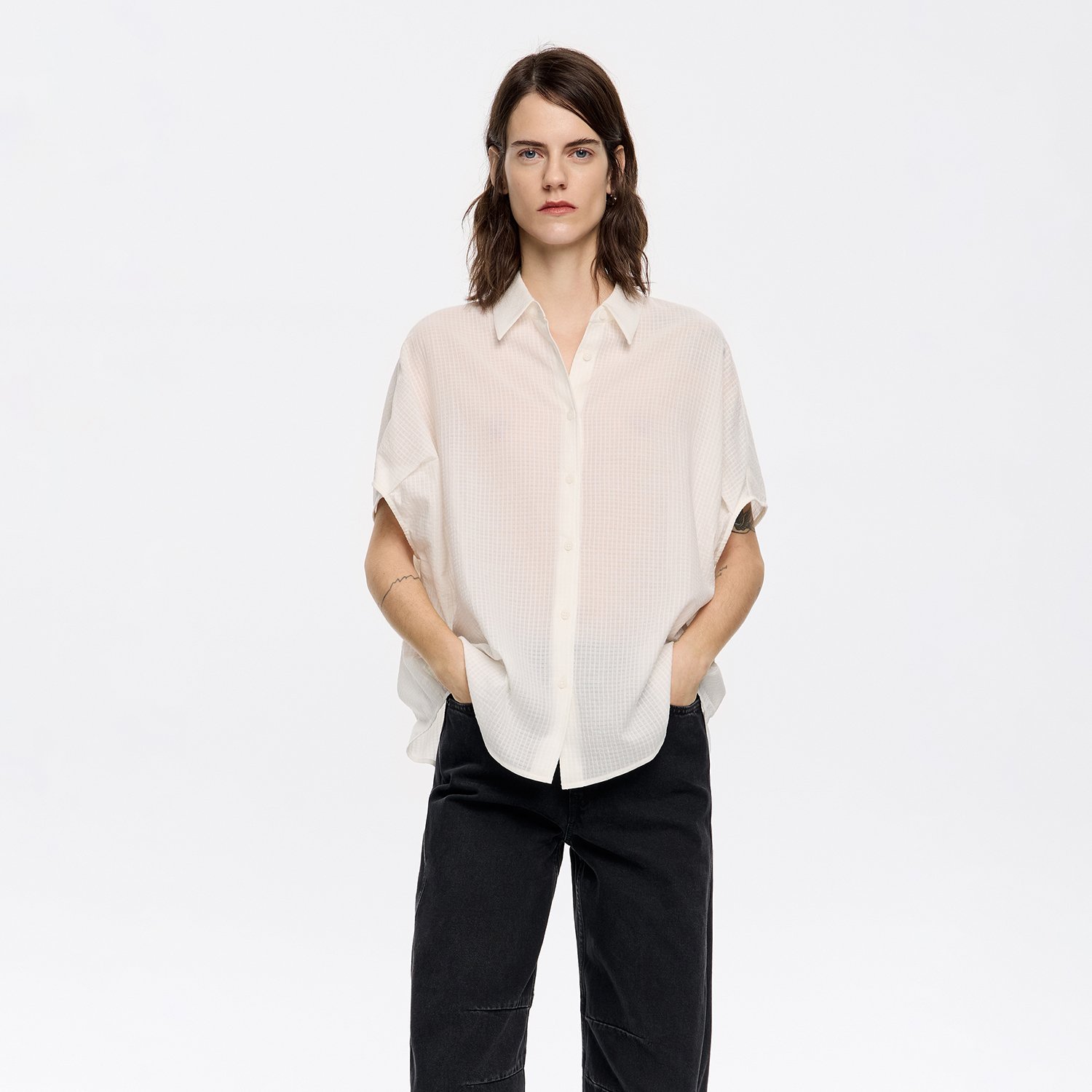 Short shirt 100% cotton Shirt collar Short batwing sleeves Button-up front