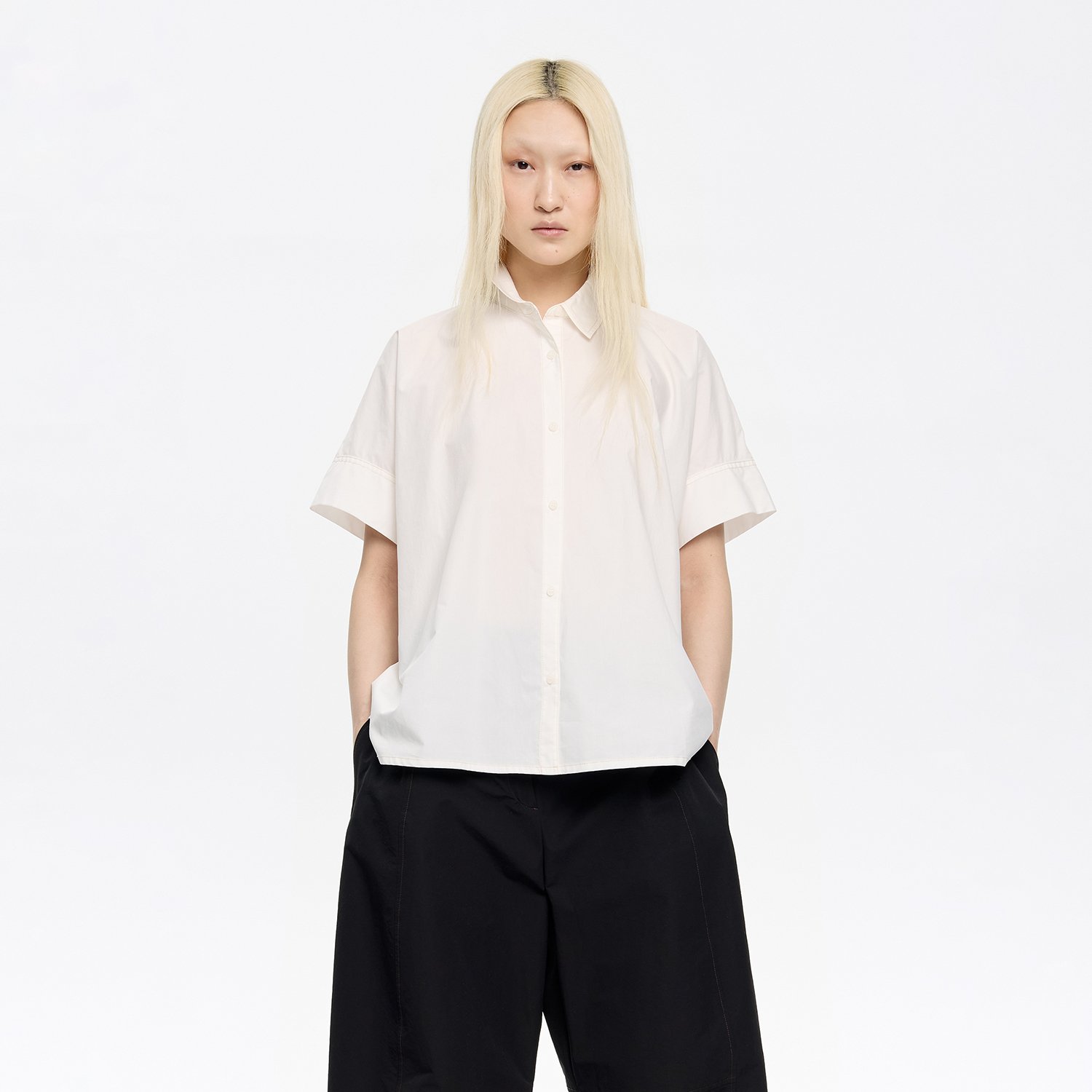 Shirt Oversize cut 100% cotton Shirt collar Short, straight and wide sleeve Button-up front All-over contrast stitching