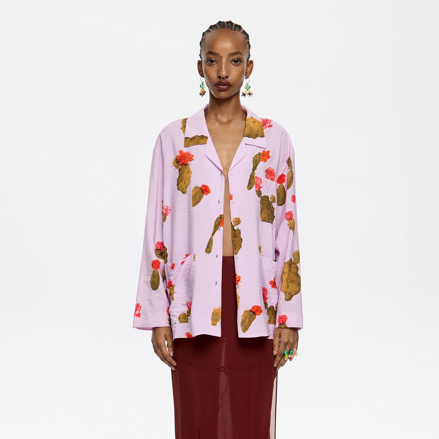 Shirt in pink with Small Cactus print. Straight cut with lapel collar, long straight sleeve and button-up front. Patch pockets. This model contains 100% responsibly produced viscose.