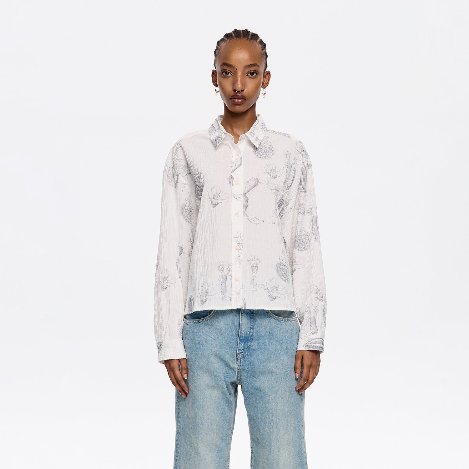 Shirt in white with Cactus Lápiz print. Boxy cut with shirt collar, long sleeve with cuff, and button-up front.