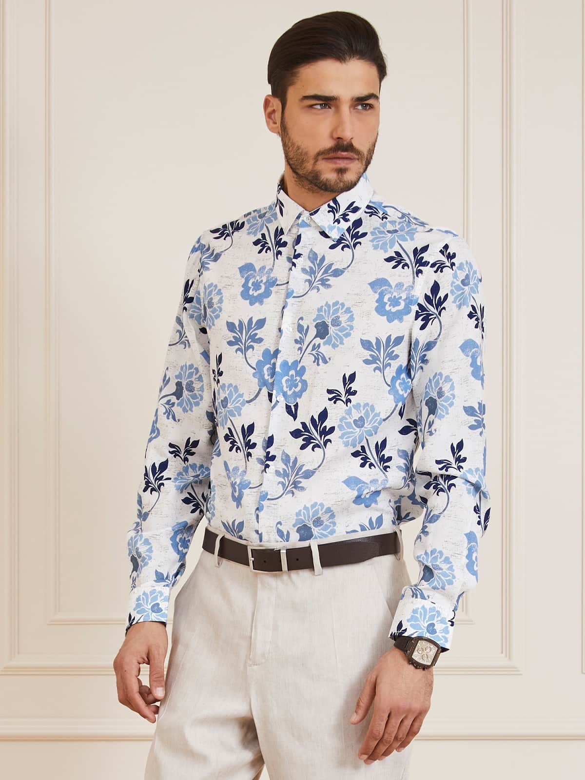 Viscose shirt.Classic collar.Long sleeves.Slim fit.Buttons fastening.FABRIC DETAILS: Floral print. Picture shows size 42.Total length: 80 cm / 31.5 inch.Sleeve length: 67,5 cm / 26.57 inch.