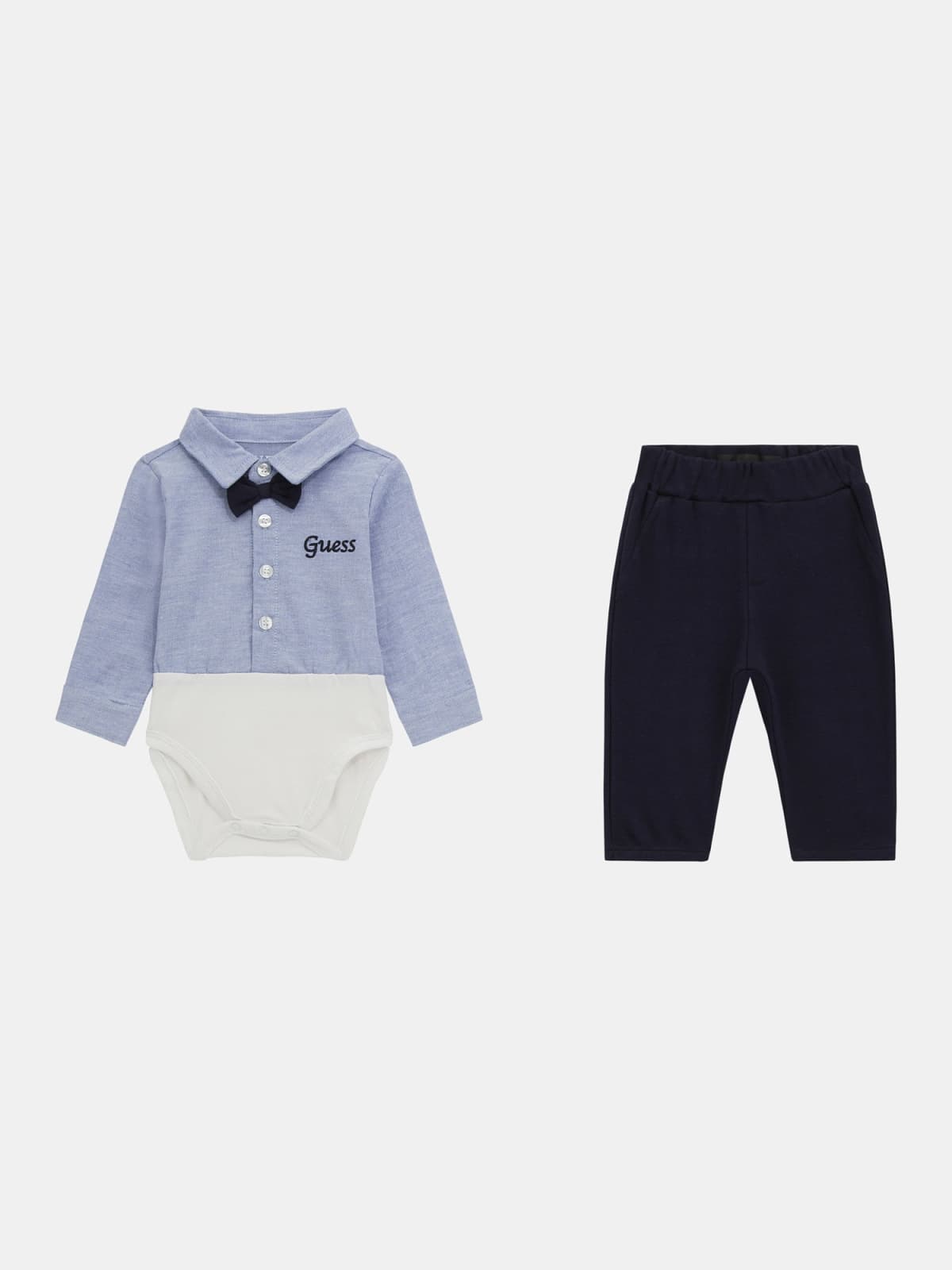 Cotton blend set.Body: shirt Collar, long sleeve.Pant: mid rise, relaxed fit.Body: buttons fastening.FABRIC TYPE: Oxford.EMBELLISHMENTS: Small side logo embroidery. MEASUREMENTS:Total length:Size 0/3M: 19,5cm/ 7,68 inch.- Size 3/6M: 20,2cm/ 7,95 inch.Size 6/9M: 20,9cm/ 8,23 inch.- Size 12M: 21,6cm/ 8,5 inch.Inseam length:Size 0/3M: 16cm/ 6,3 inch.- Size 3/6M: 19cm/ 7,48 inch.Size 6/9M: 22cm/ 8,66 inch.- Size 12M: 25cm/ 9,84 inch.True to size.