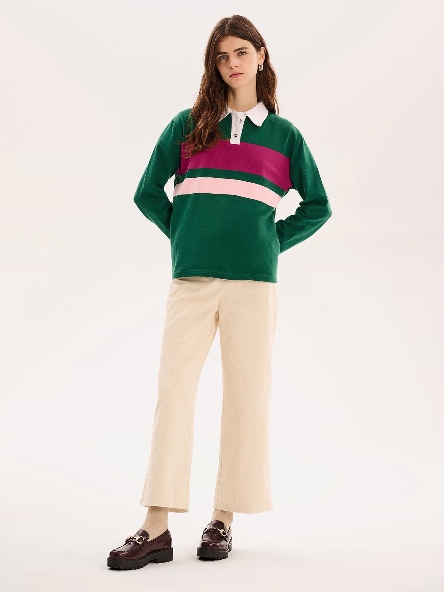 Hugo is our rugby-inspired, long-sleeve polo shirt. A colour-pop stripe design enhanced by a contrasting collar, Hugo is woven from a thick BCI member cotton for an oversized fit.
