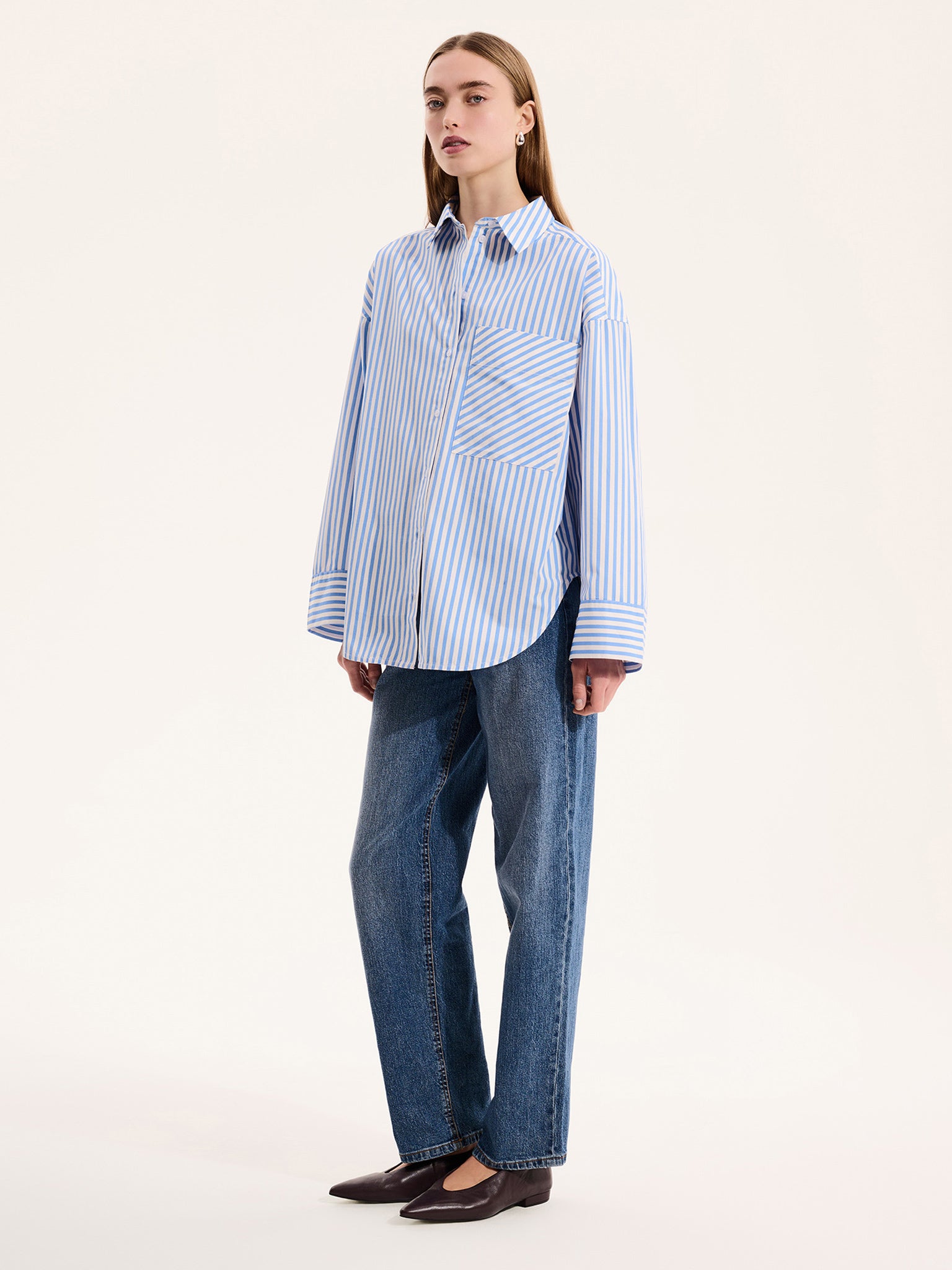 Kendra is a classic overshirt offering effortless style. Inspired by painter’s smocks, embrace your artistic spirit with this lightweight ethical cotton shirt. The wide cuffs are designed with an adjustable button so you can cinch them in or keep things breezy and the oversized pocket adds a little something extra to the blue pinstripe pattern.