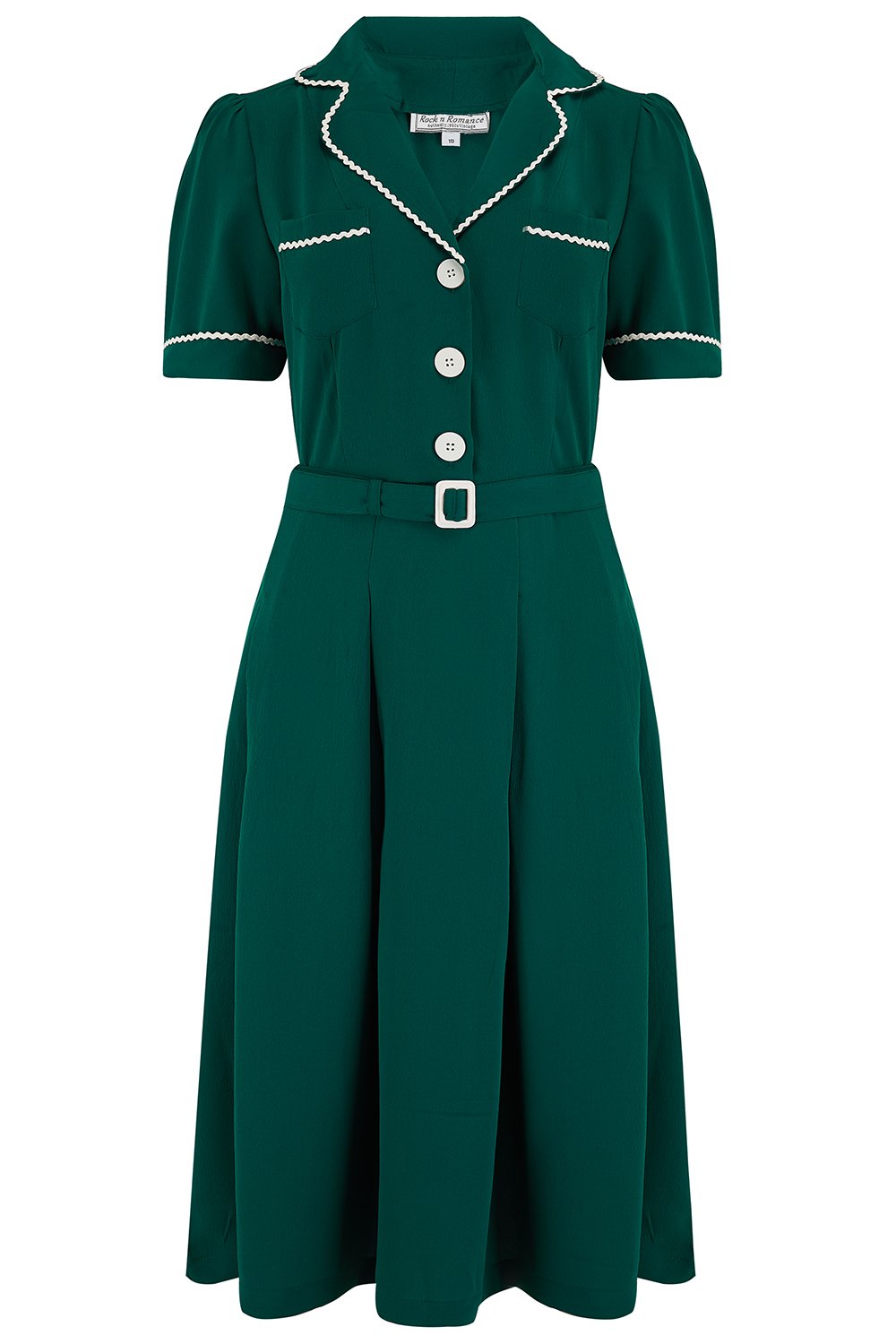 Say hello to our classic Kitty Dress!  Stay comfortable and classy no matter the occasion, in gorgeous rich solid colours with beautiful contrasting ric-rac on the collar; breast pockets & sleeve cuffs, to really set this piece off and make it a little bit special. A truly stunning dress that oozes with charm and sophistication, just perfect for work or play. And if that wasn’t enough it has hidden inseam pockets too, yes we said pockets! This classic late 1940s early 50s Shirtwaister dress is true to the era and simply perfect as an easy to wear all-rounder, we really couldn’t love it any more.  The iconic 1950s style is as close to true vintage as you would ever want. The authentic Poly Crepe fabric hangs beautifully & is super soft to the touch and easy to care for too, just machine wash at 30 degrees.. We are that confident you will simply adore this item we are even giving you a full 14 day, 100% satisfaction or your money back Guarantee.. What more is there to love.. ?   ​Quick International Size Conversion Guide: ​UK 8, EU 36, US 4 UK 10, EU 38, US 6 UK 12, EU 40, US 8 UK 14, EU 42, US 10 UK 16, EU 44, US 12 UK 18, EU 46, US 14 Please note, All our items are sold in UK sizing .. Australia Dress sizes are the same as UK​