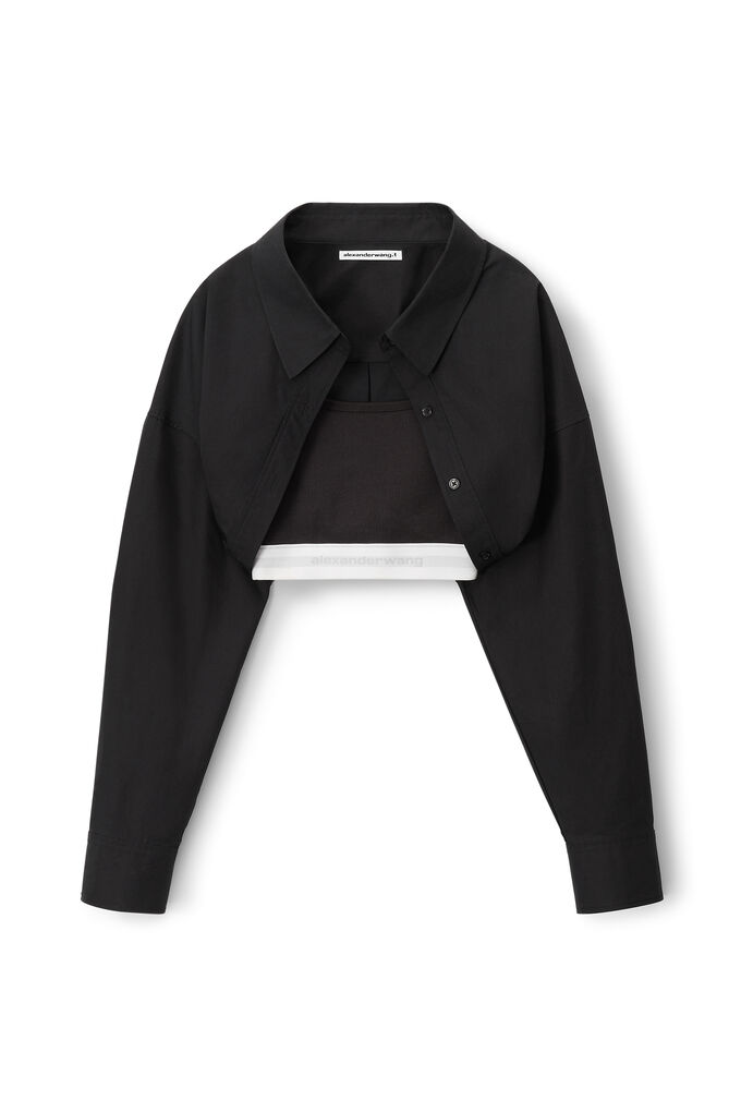 T By Alexander Wang Layered Cropped Shirt Black A black cropped bolero, cleverly tucked and crafted from dense compact cotton, complements a layered ribbed cropped top with a distinctive logo elastic finish. HIGHLIGHT Rear hem with elastic Falls above the waist Without a lining Composition Bolero: 100% cotton Top: 68% cotton/ 28% polyamide/ 4% elastane Trim: 60% polyamide/ 28% polyester/ 12% elastane Product ID: 4WC4231417-001 Season: FW23 collection