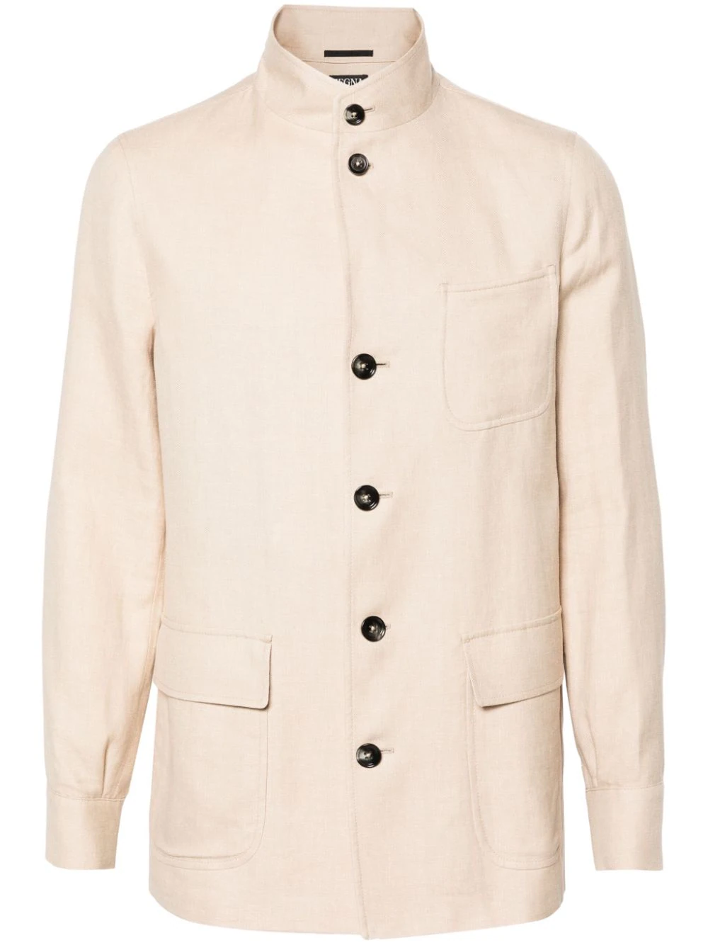 ZEGNA LINEN-Blend SHIRT JACKET Beige Exemplifying Zegna’s dedication to enduring design, this jacket is meticulously fashioned from brown linen, embracing a classic overshirt silhouette. The concealed front fastening enhances the jacket’s minimalist aesthetic, contributing to its timeless appeal.   Highlight Flax-wool blend Mandarin collar Front button fastening Long sleeves Buttoned cuffs Chest patch pocket Two front flap pockets Straight hem   Composition: Outer: Linen/Flax 60%, Wool 40% Lining: Cupro 100%   Product ID: 776C53A7-1DHZQ0 Season: PS24 Collection