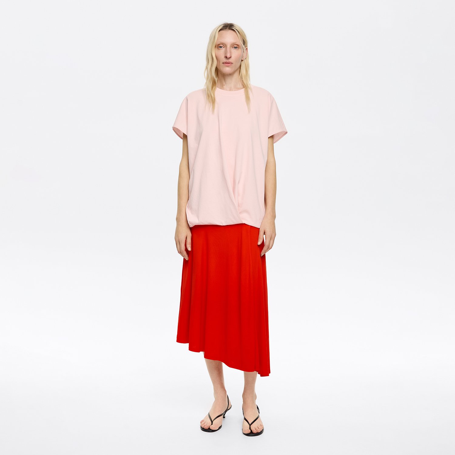 Midi two-material sweatshirt dress in pink and red. Fitted at the hip, with a crew neck, short batwing sleeves and pleats at the front and back. Flared fluid skirt with slit.