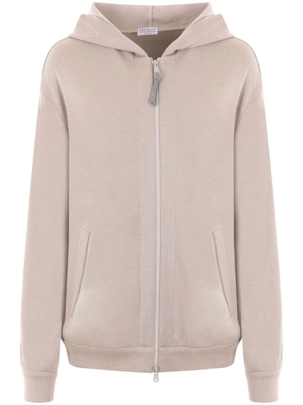 BRUNELLO CUCINELLI Monili-embellished Hoodie SWEATSHIRT Light Beige The Brunello Cucinelli Monili-Embellished Hoodie Sweatshirt in Light Beige combines luxury with casual comfort. This relaxed hoodie is elevated with the brand’s signature Monili embellishments for a refined touch of sparkle. Its versatile neutral shade and understated detailing make it a perfect addition to any wardrobe, offering both style and ease for everyday wear.   Highlights  Cotton silk blend Signature Monili chain detail Classic hood Front two-way zip fastening Long sleeves Slip pockets to the sides Straight hem Ribbed cuffs and hem   Composition Eco Brass 100%, Cotton 67%, Silk 31%, Nylon 2%   Designer ID: MD828SB806-C9593 Season : FW24 Collection     SHOP MORE : Brunello Cucinelli Sale   Brunello Cucinelli Gilet   Brunello Cucinelli Jackets