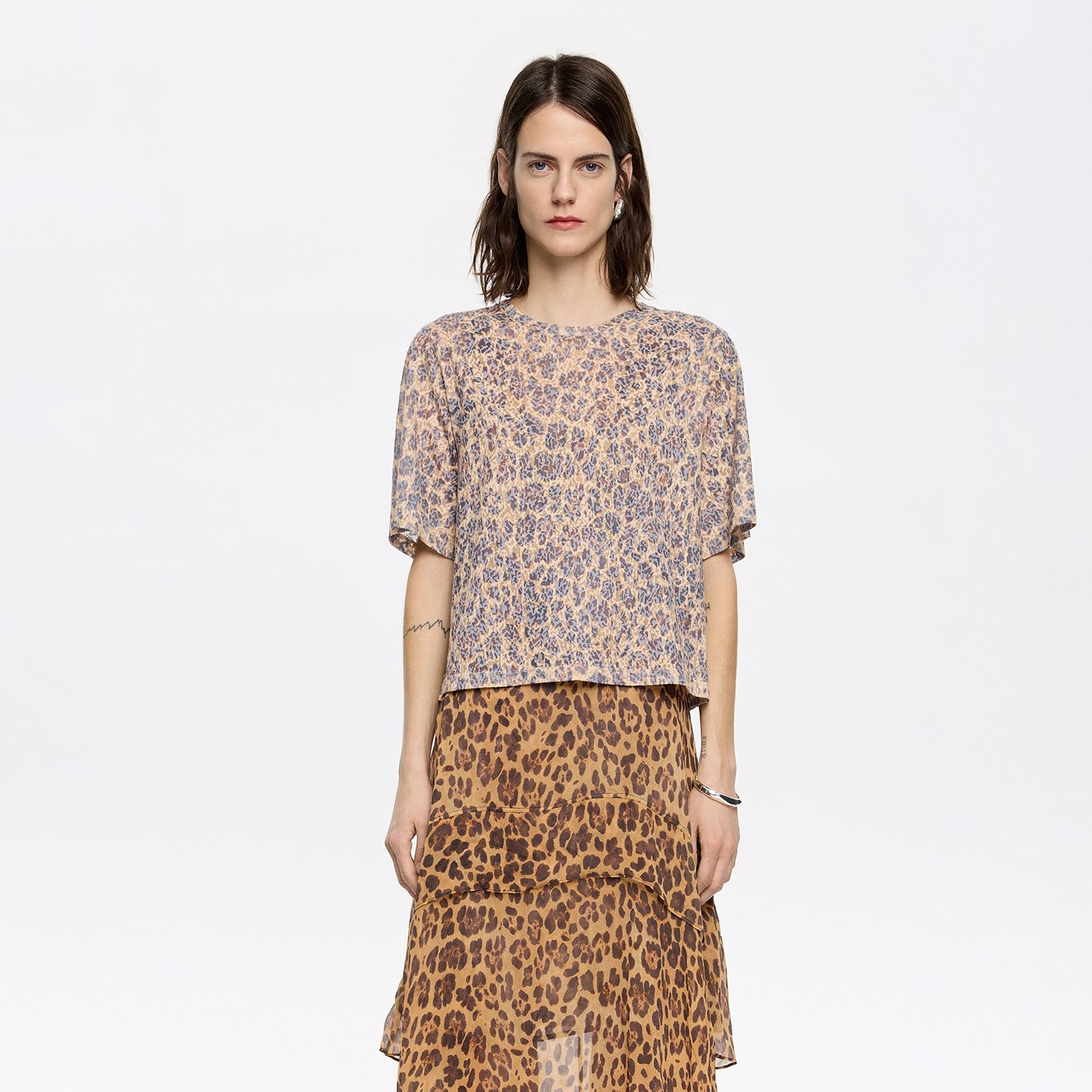 T-shirt in beige with Leopard print. Straight cut with crew neck and short sleeve.