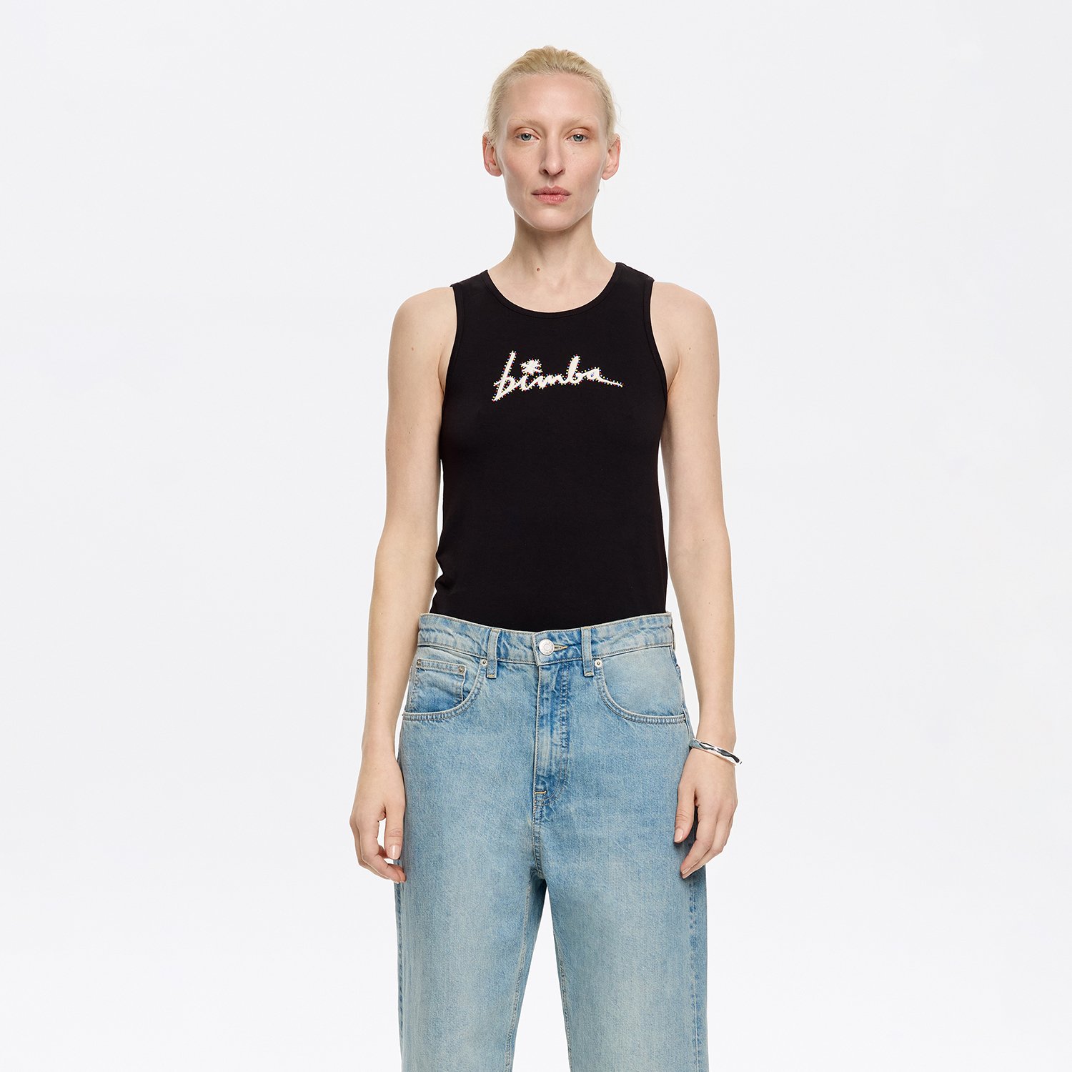 T-shirt Fitted cut Round neckline Sleeveless Embroidered logo with multicolor beads