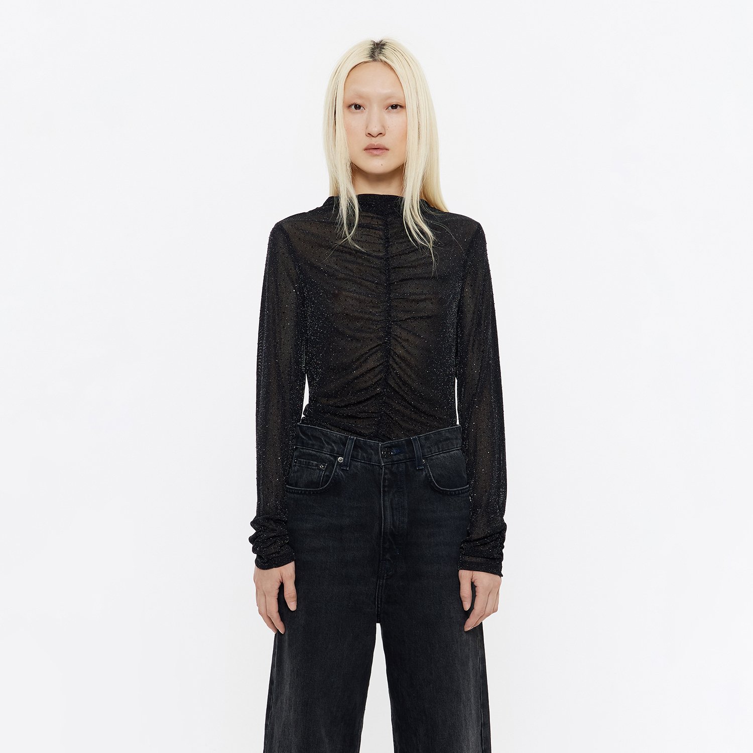 Tulle T-shirt in black. Tight fit, with high neck and long ruched fitted sleeve. Ruched front and back, and all-over rhinestones.