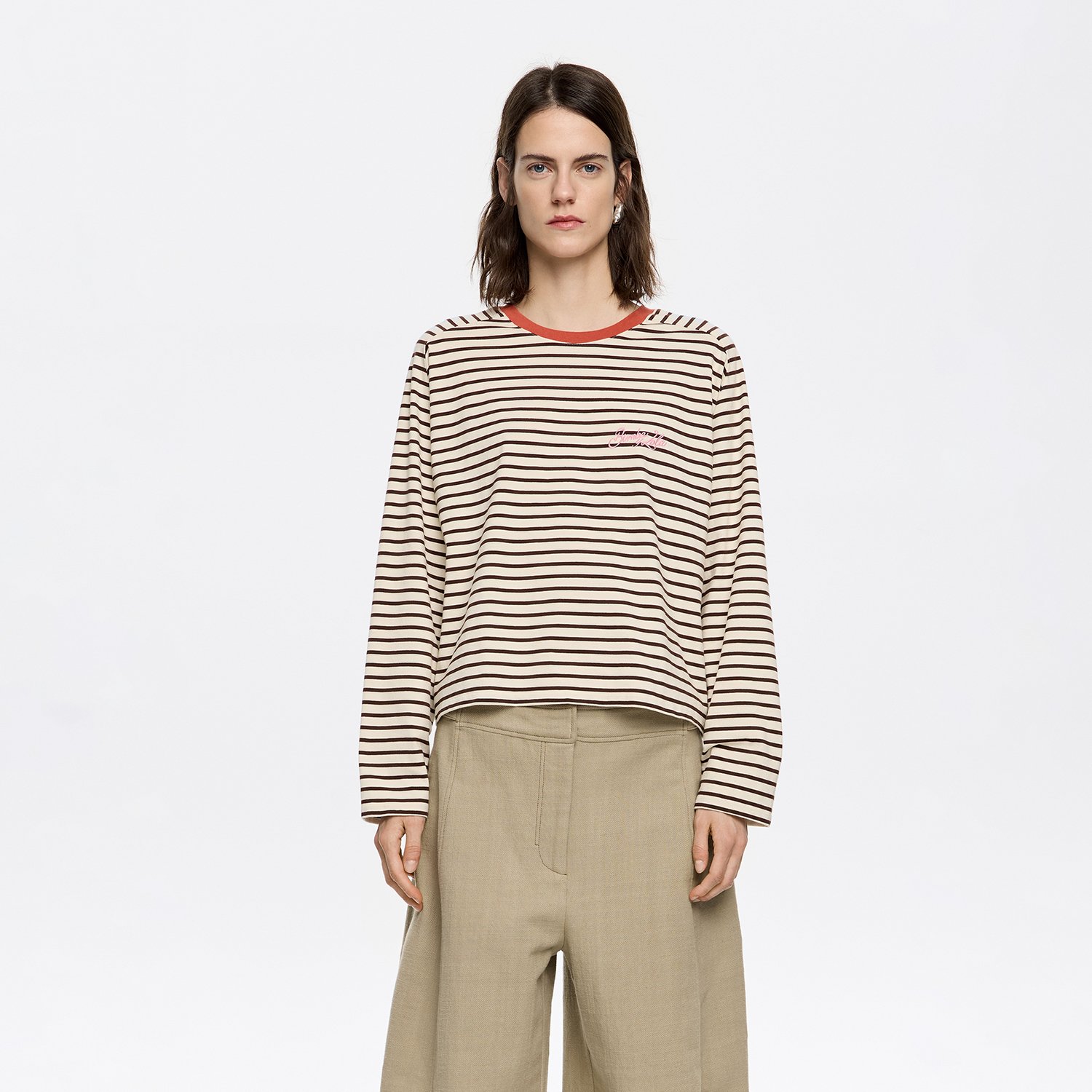 Striped print cotton T-shirt in brown. Straight cut, crew neck with contrast piping, and long straight sleeve. Exterior customized with embroidered logo.
