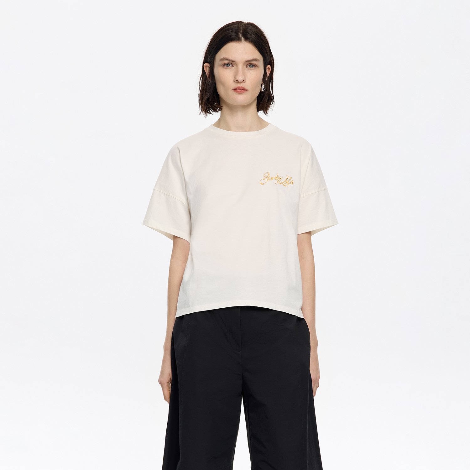 Cotton T-shirt in ivory. Boxy cut, crew neck, long straight sleeve and exterior customized with embroidered logo. This model contains 100% organic cotton.