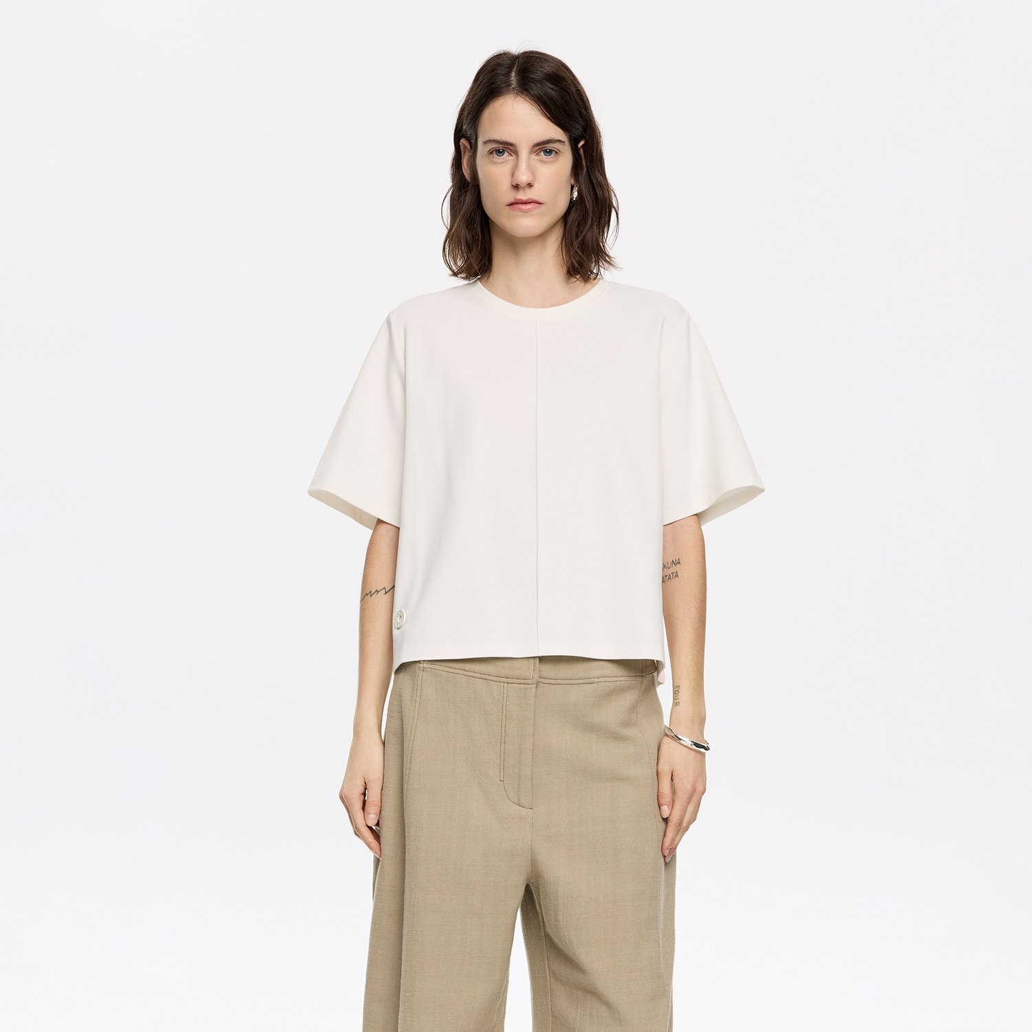 Ponte di roma T-shirt in ivory. Straight cut with crew neck, short straight sleeve and piped seam down the front. Exterior customized with Chimo logo.