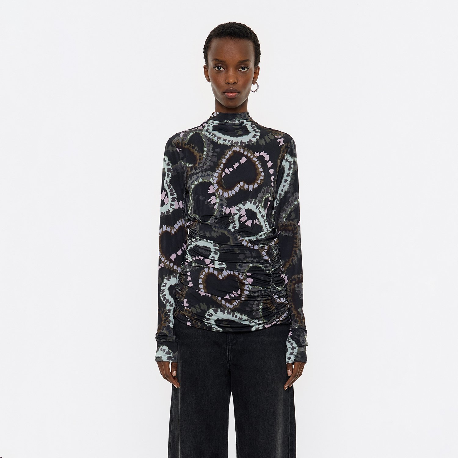 Viscose T-shirt with Lovecamu print in khaki. Fitted design with high neck, long fitted sleeves with ruched body and cuffs.