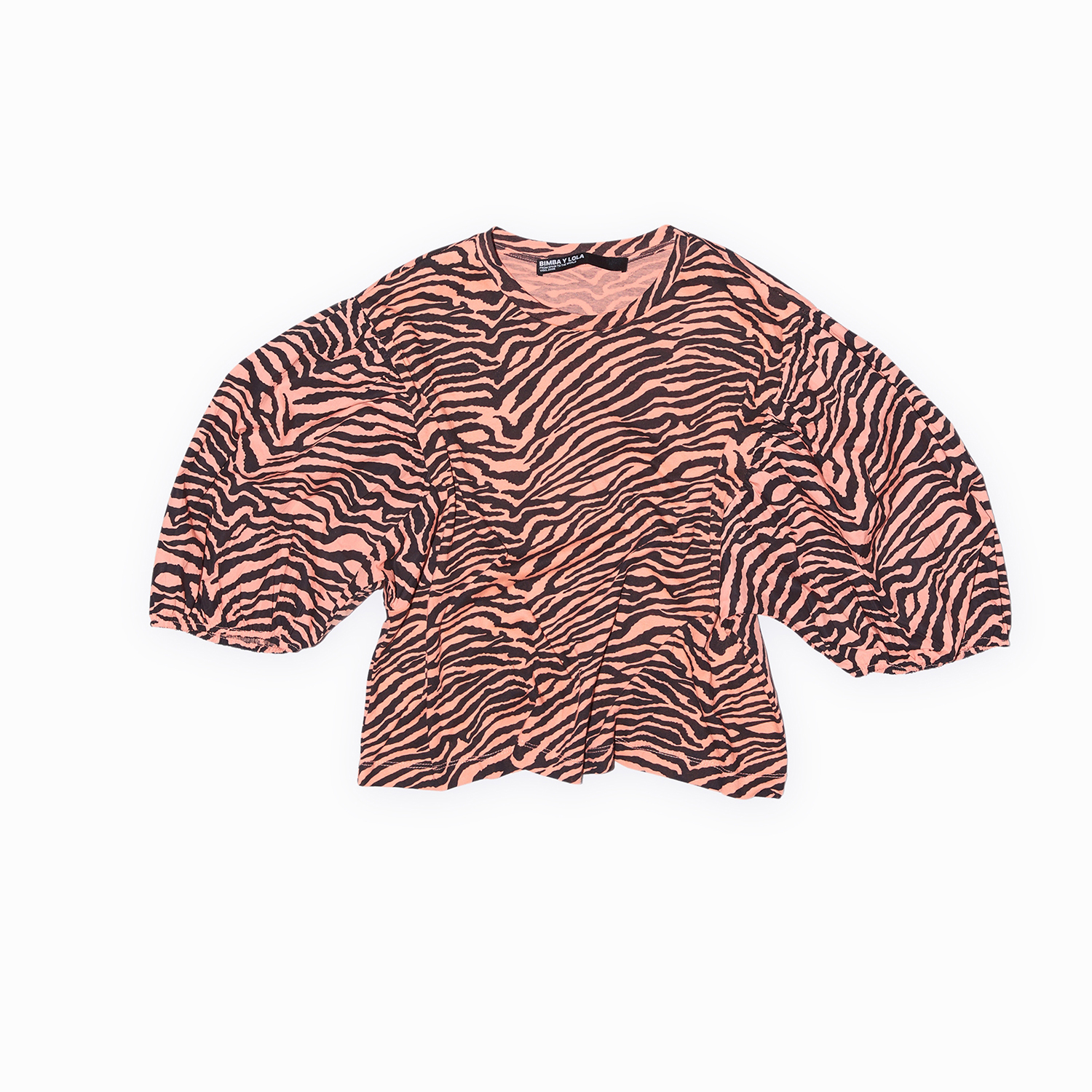 Cotton T-shirt with Tiger print in peach. Straight cut, short puff sleeve and crew neck.