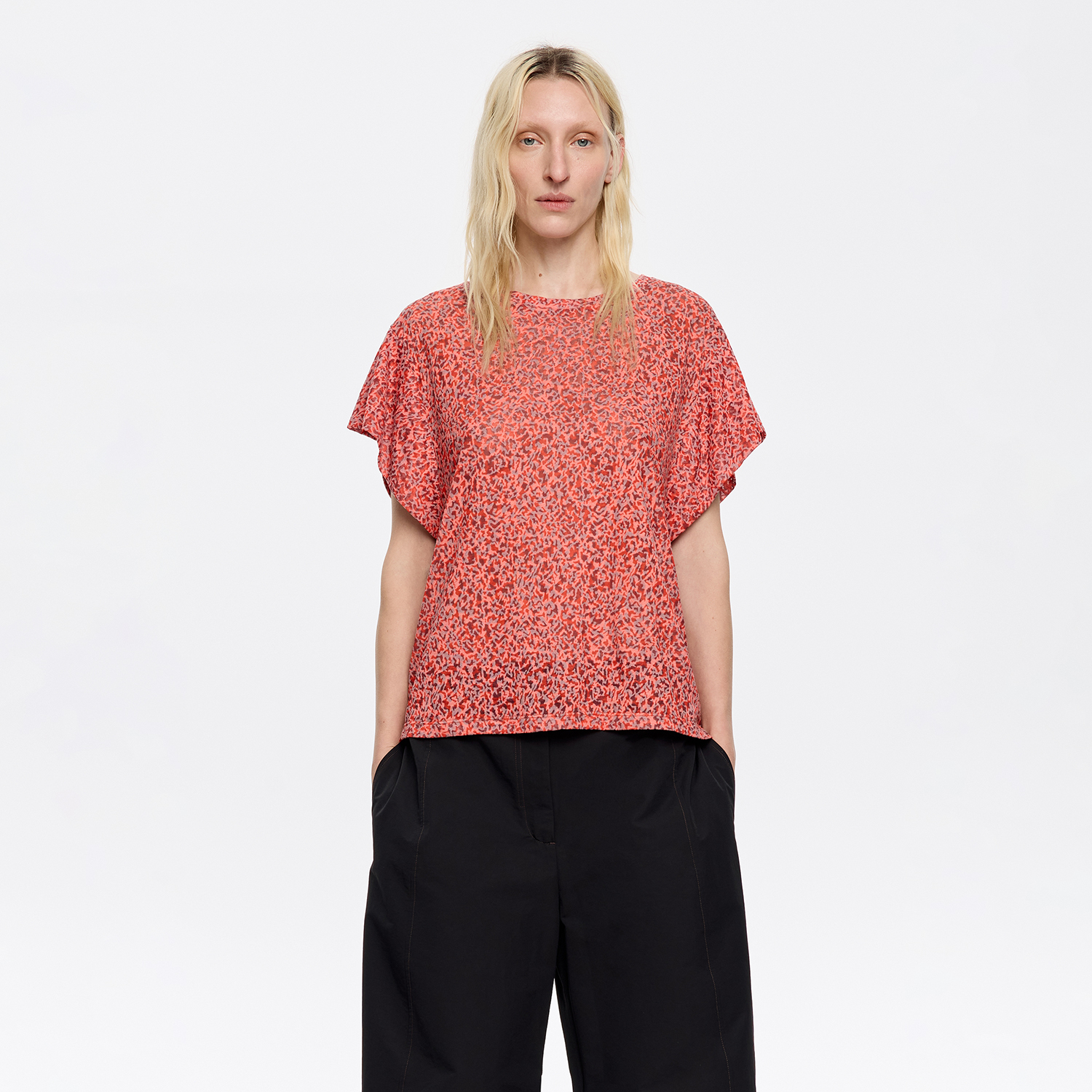 Devoré cotton sweater with Animalspots print in red. Straight cut design with crew neck and short, wide straight sleeves.