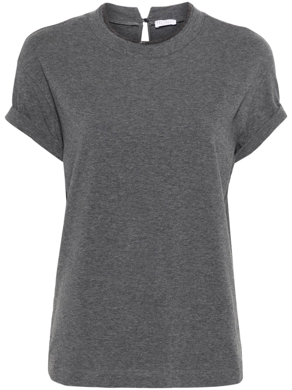 BRUNELLO CUCINELLI Contrast Layered T-SHIRT Grey Brunello Cucinelli’s signature Monili beads circle the neckline of this T-shirt, lending it an elevated finish in line with the label’s haute-minimalist aesthetic. It’s cut from stretch-cotton mélange and is complete with turn-up cuffs and a keyhole opening at the nape. Highlights Mélange effect Stretch-cotton Soft jersey Rounded collar Bead detailing Short sleeves Turn-up cuffs Keyhole detail to the rear Internal logo tag Straight hem Rear button fastening Composition Brass 100%, Cotton 93%, Elastane 7% Designer ID: M0T18BD200-CV563 Season : FW24 Collection SHOP MORE : Brunello Cucinelli Sale Brunello Cucinelli Gilet Brunello Cucinelli Jackets